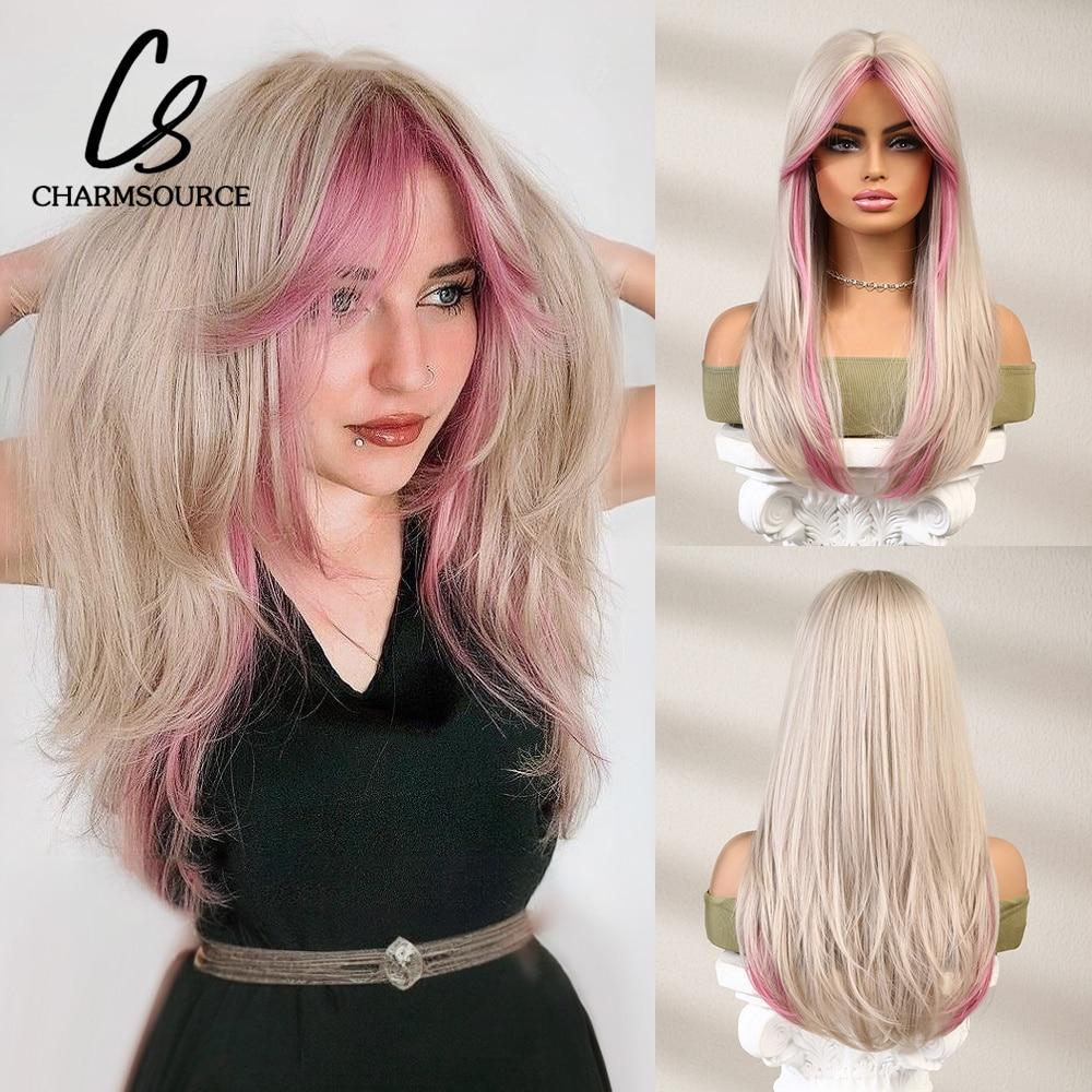 Смешанный светло-русый и розовый парик, длинные волнистые парики с челкой для женщин, синтетический парик, косплей, повседневные термостойкие волосы — купить товар онлайн с бесплатной доставкой по всему миру!
