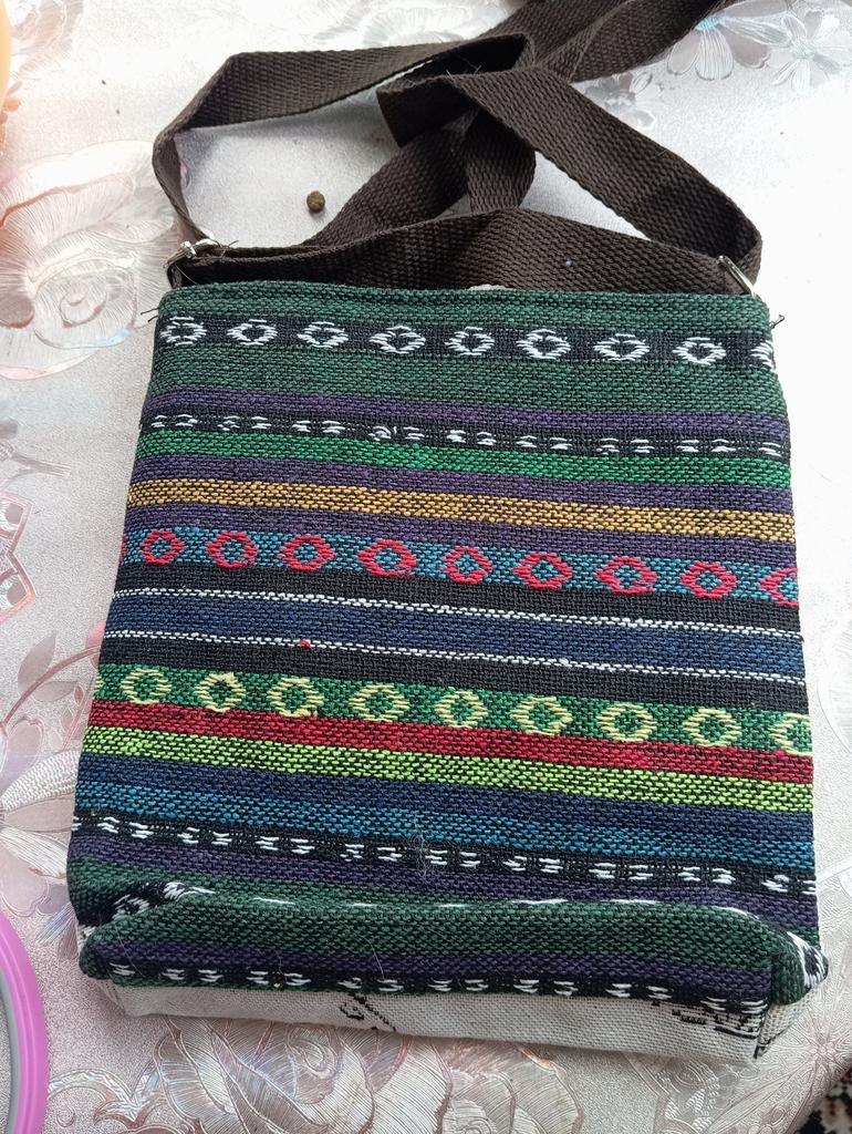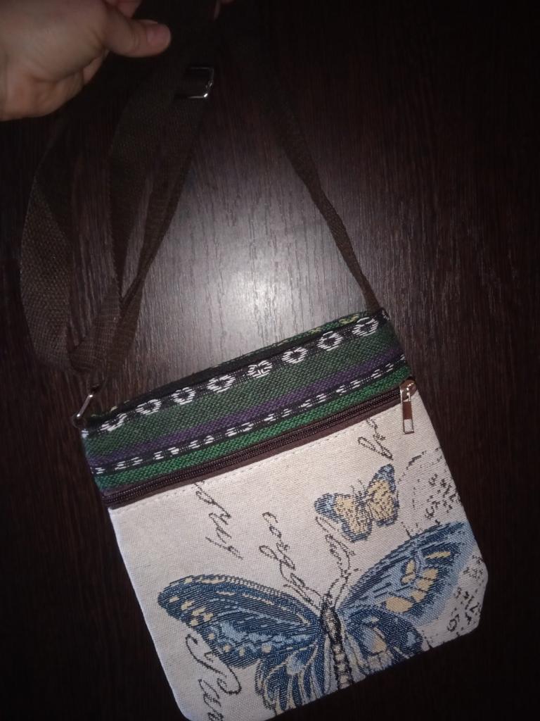 Женская сумочка через плечо, ремешок можно регулировать на нужную длину. Ткань плотная материя типа холщевки с рисунком бабочки, для лета 👍имеется спереди кармашек на молнии. ( брала за 517 руб)
