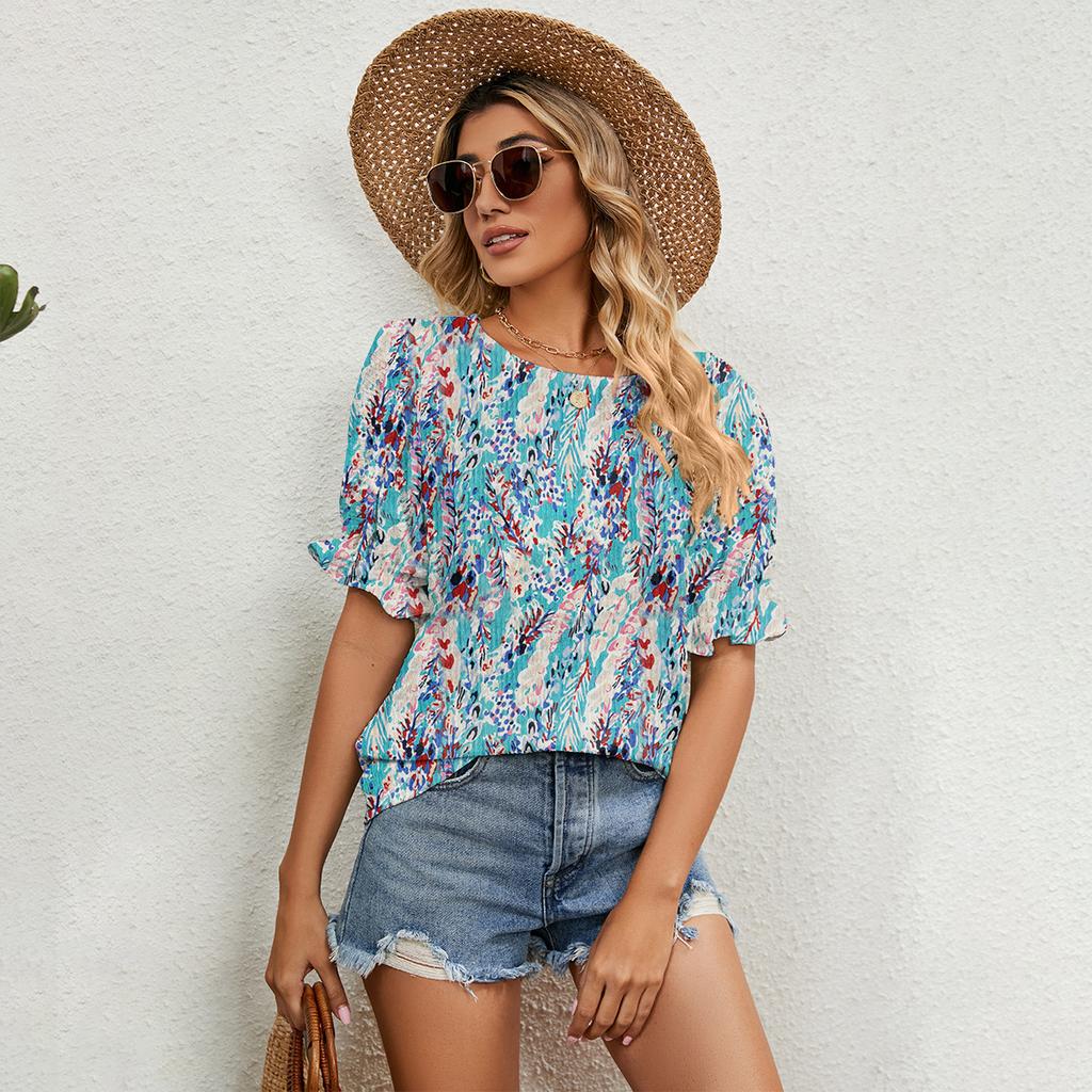 GMXIA Женские модные повседневные блузки и рубашки с цветочным принтом и коротким рукавом с круглым вырезом