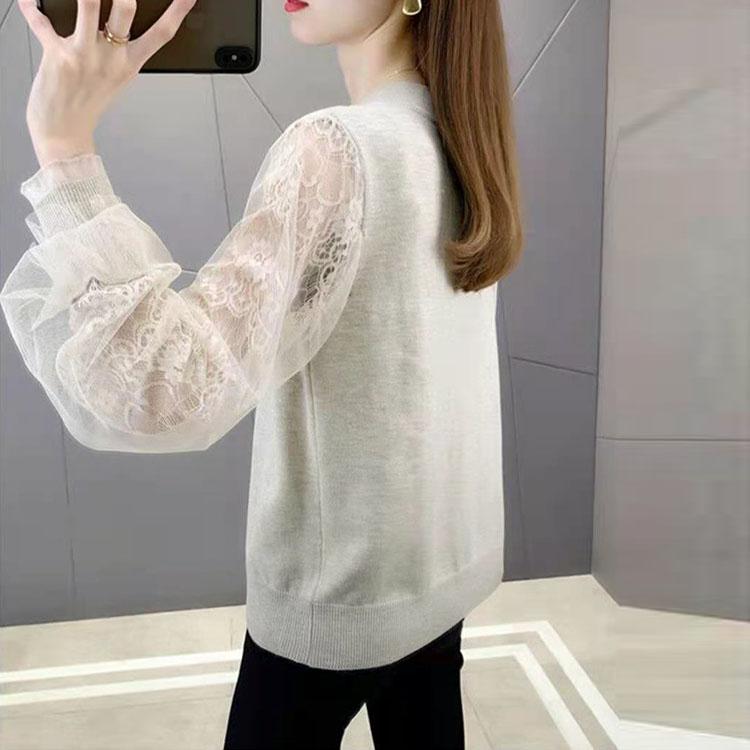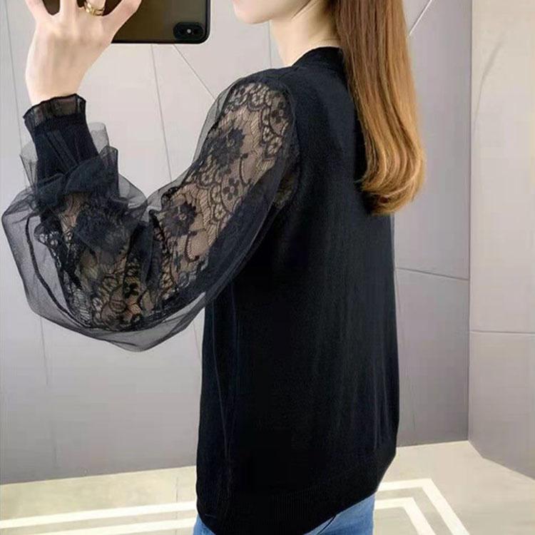 Открытая трикотажная рубашка из ледяного шелка, женская весна 2023, новая кружевная сетчатая подкладка с v-образным вырезом, однотонный пуловер с длинными рукавами, женский топ