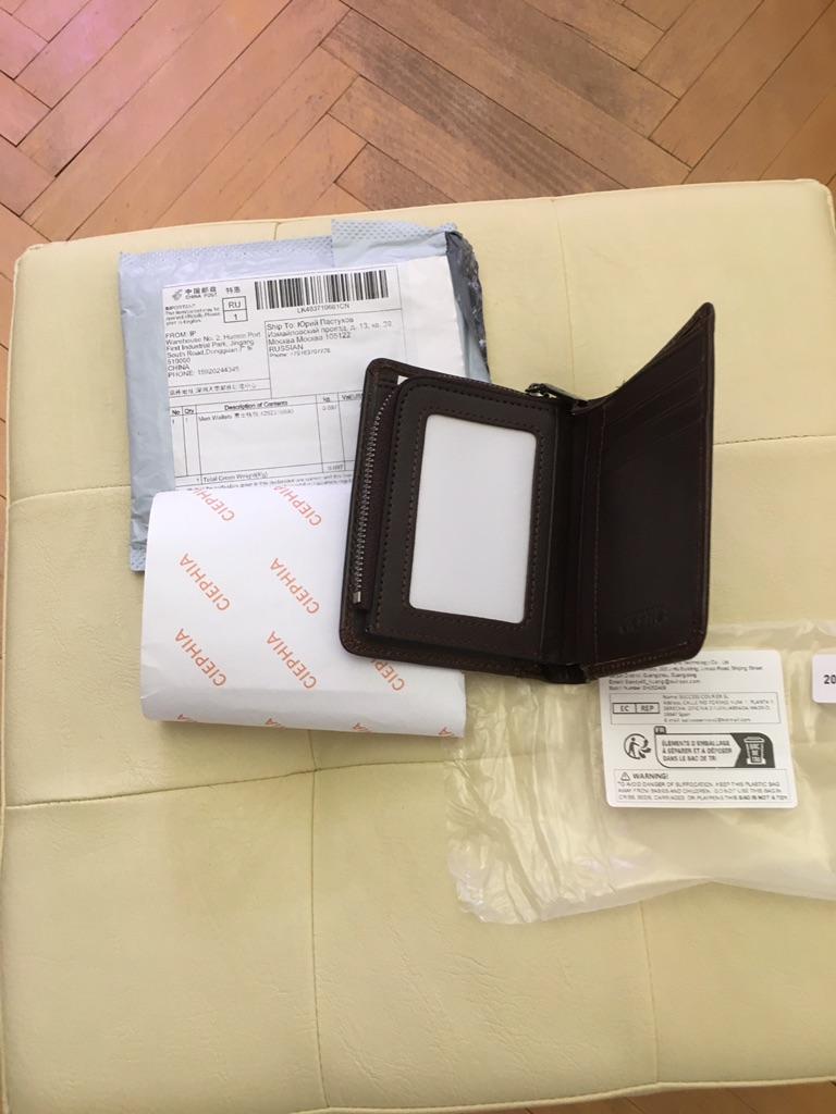 Заказ шёл меньше месяца. Пришло все целым. Кошелёк хорошего качества, нитки не торчат все прошито. Купюры входят есть отделение с замком для мелочи и защита карт. Товаром доволен, продавцу спасибо.