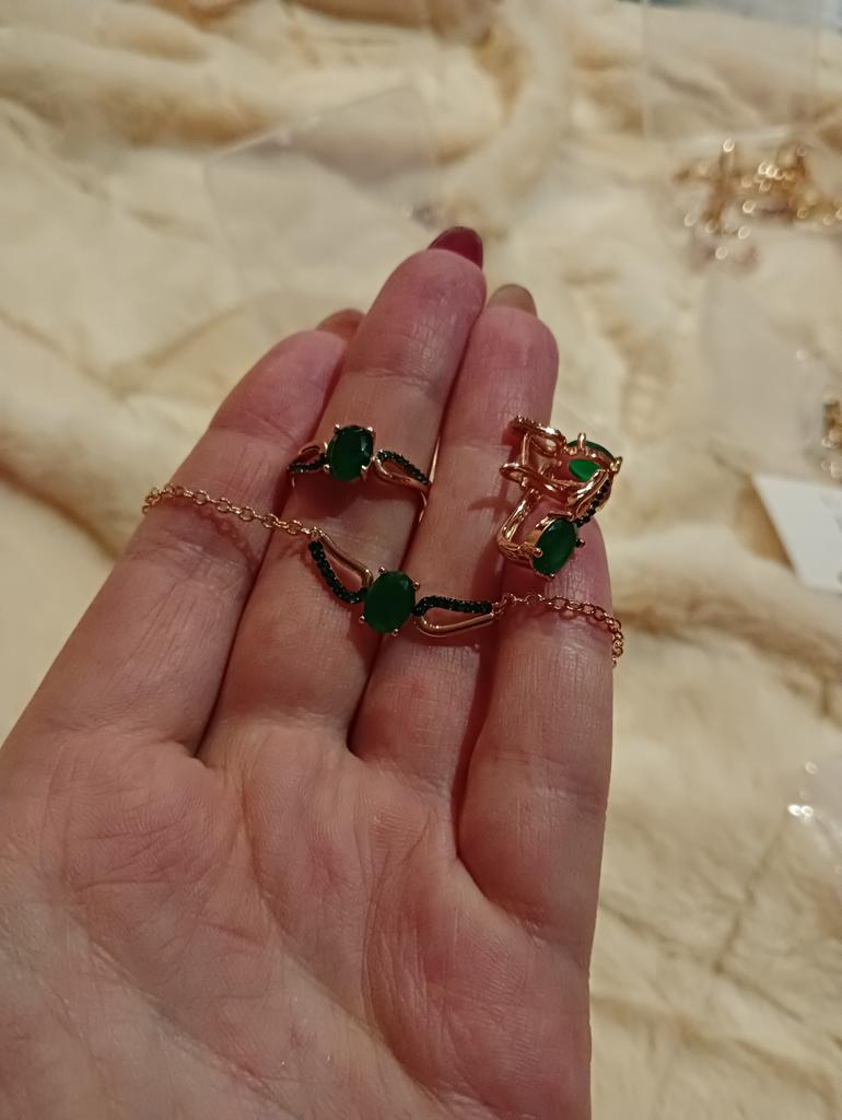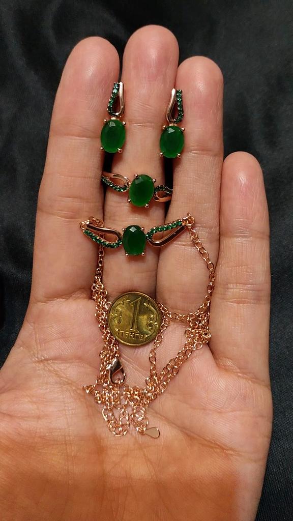 Здравствуйте! Собрала такой красивый набор с зелёными камнями под изумруд, смотрится великолепно. Металл под золото, есть проба 585:) Правда думала, что колье будет по крупнее, но нет оно изящное, нежное, даже лучще чем ожидала. Всё соответствует описанию. Рекомендую! Дополняю: при вечернем свете мелкие зелёные хрустальные камешки становятся светло-салатовые и ярко блестят, аж глаз не оторвать от такой красоты. При дневном свете не обращала внимание, а днём кажется темнее:))) В общем ещё раз убедилась, что не зря приобрела такую нежность. БлагоДарю коллектив Джум!!!