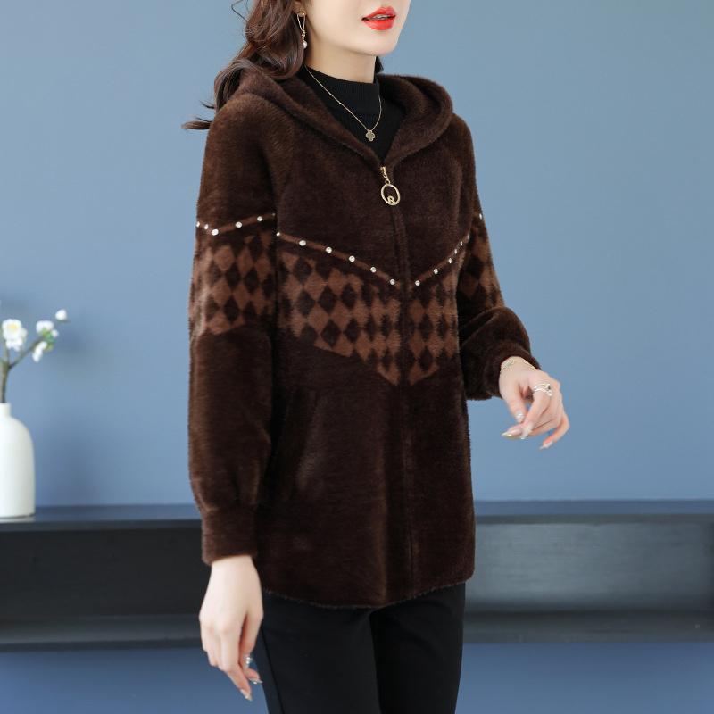 Новое осенне-зимнее пальто для мам среднего возраста из искусственного норки, бархатное пальто, женский повседневный вязаный кардиган на молнии с капюшоном, женские куртки
