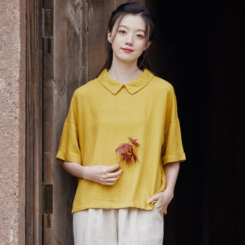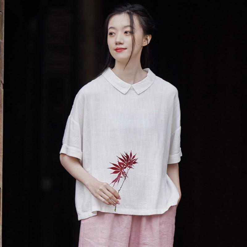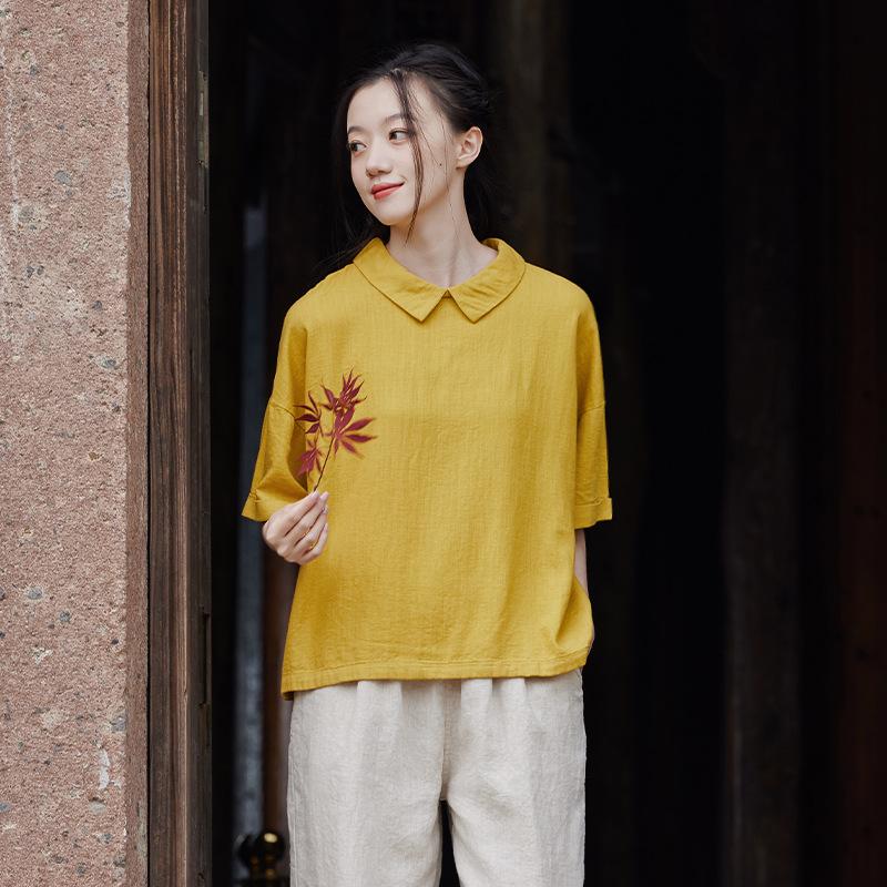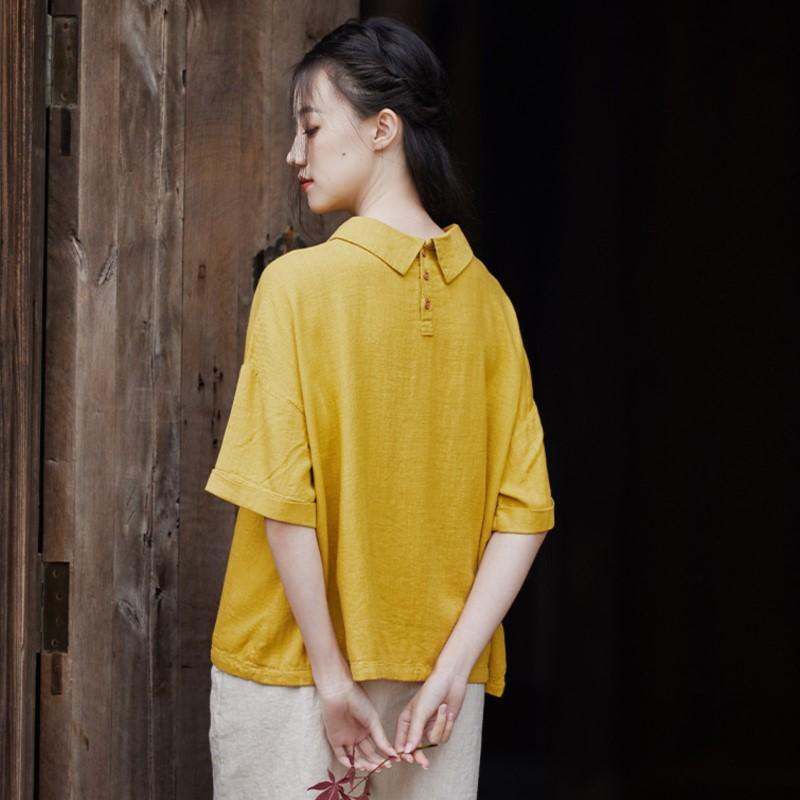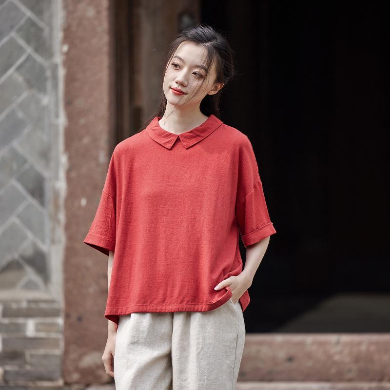 Johnature Женские льняные футболки-пуловеры, однотонные отложные цветные летние свободные повседневные женские футболки с короткими рукавами