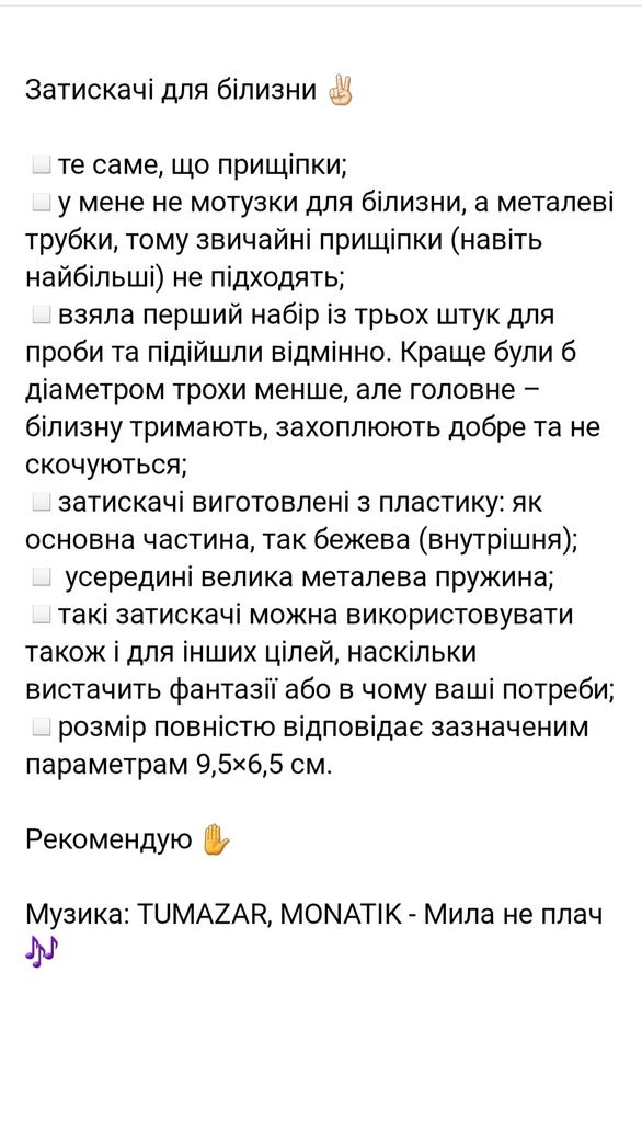 Зажимы для белья ✌🏻 ◽то же самое, что прищепки; ◽у меня не бельевые верёвки, а металлические трубки, поэтому обычные прищепки (даже самые большие) не подходят; ◽взяла первый набор из трёх штук для пробы и подошли отлично. Лучше были бы диаметром чуть меньше, но главное - бельё держат, захватывают хорошо и не скатываются; ◽зажимы изготовлены из пластика: как основная часть, так бежевая (внутренняя); ◽ внутри крупная металлическая пружина; ◽такие зажимы можно использовать также и для других целей, насколько хватит фантазии или в чём ваши потребности; ◽размер полностью соответствует указанным параметрам 9,5×6,5 см. Рекомендую ✋ Музыка: TUMAZAR, MONATIK - Мила не плач 🎶