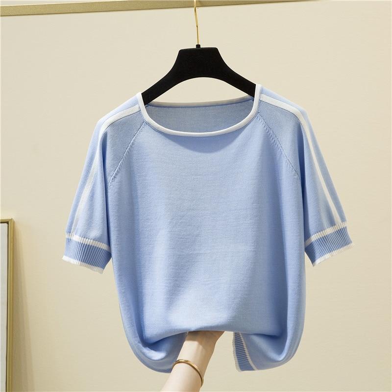 Camisetas Mujer, тонкая вязаная футболка, женские летние топы с короткими рукавами, женская одежда, модная полосатая футболка, футболка Femme 18841