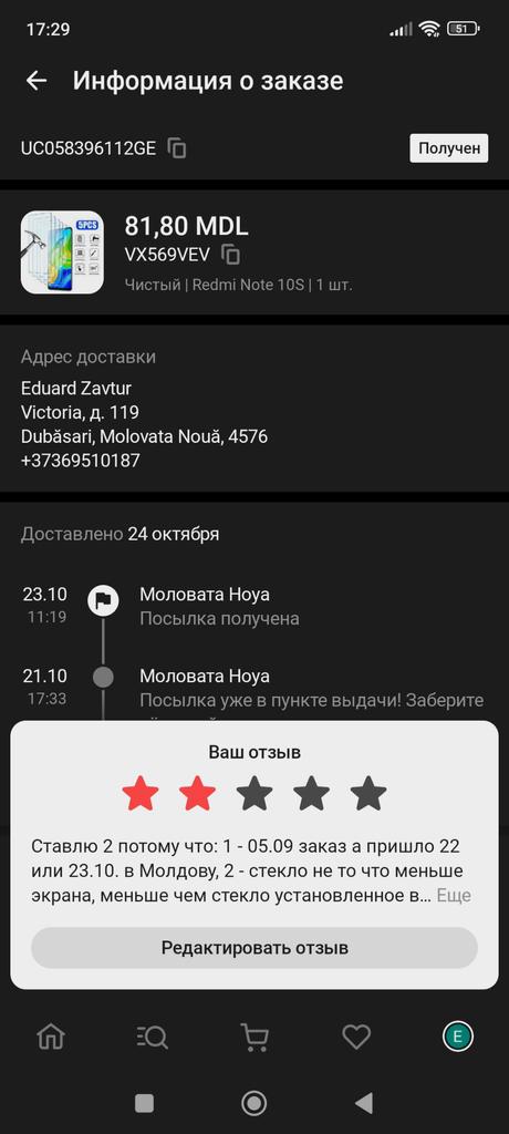Ставлю 2 потому что: 1 - 05.09 заказ а пришло 22 или 23.10. в Молдову, 2 - стекло не то что меньше экрана, меньше чем стекло установленное в Молдове. При ударе лопнет край экрана. А написано что для Xiaomi 10s. Не то. Видео и фото предоставлено. Стекло установленное в Молдове ширина 7.1см, а ето меньше 7см. Не рекомендую. Пожалуйста верните деньги меня такой товар не устраивает
