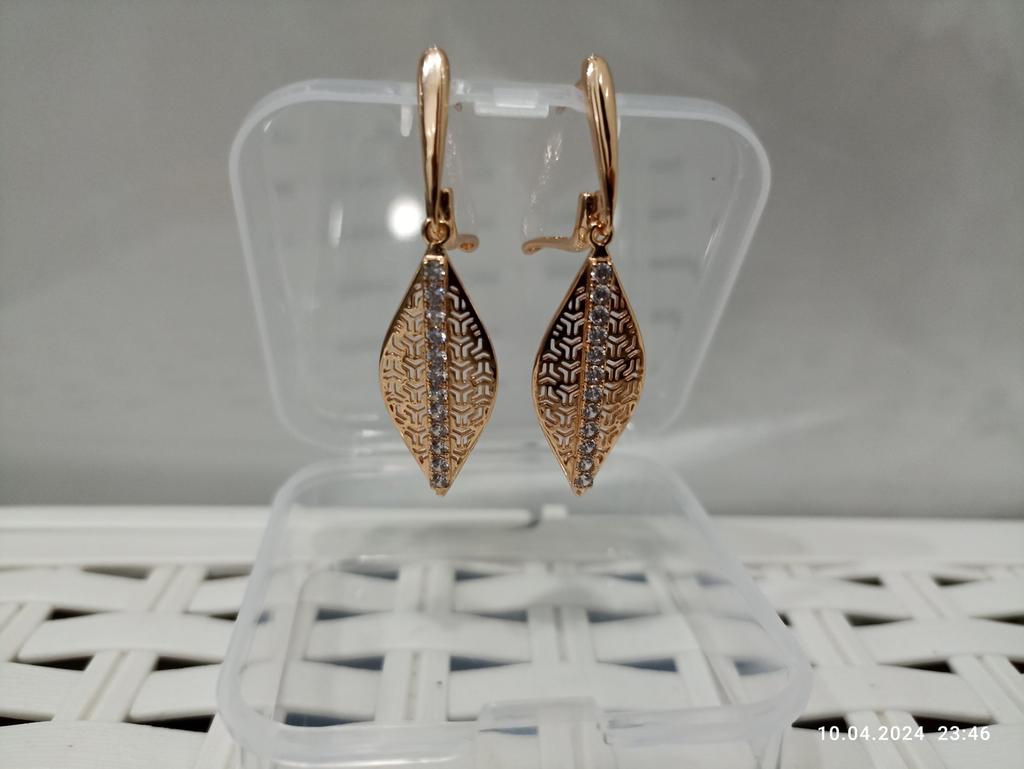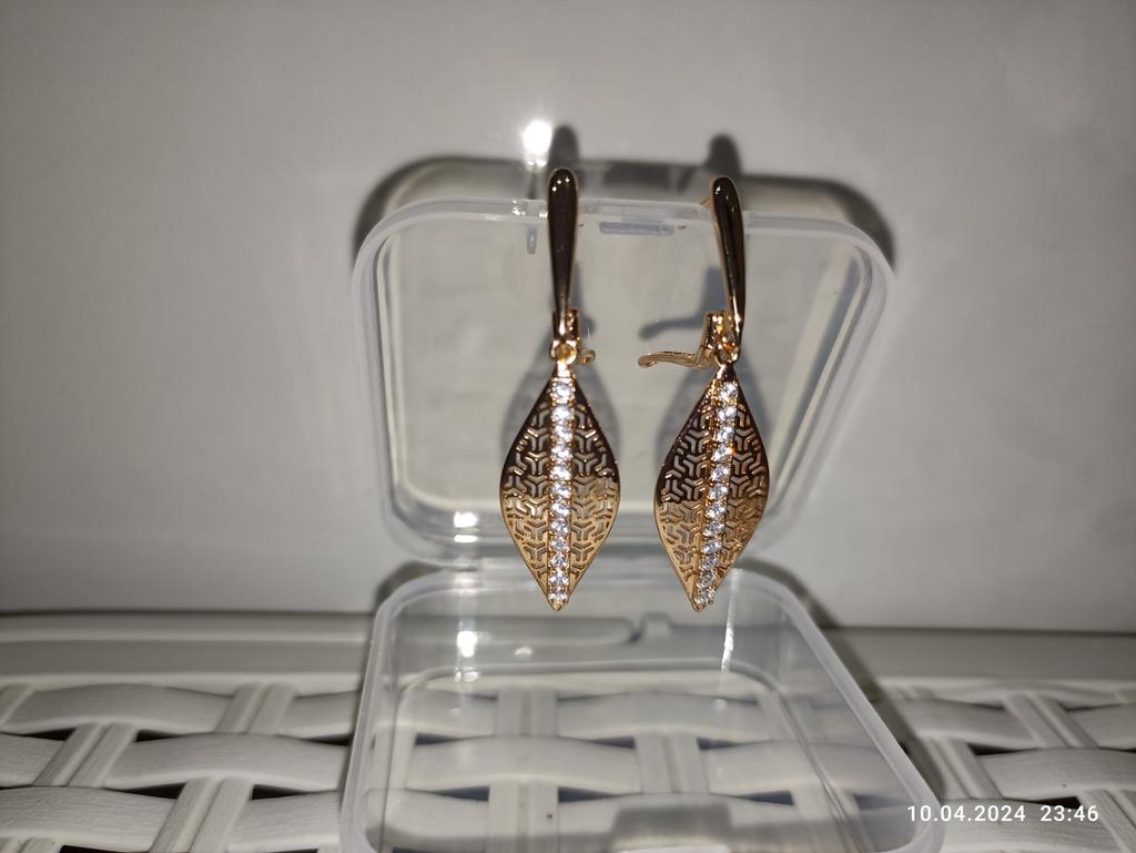 Серьги классные, очень красивые, английская застёжка сделана качественно и порадовала небольшим размером, на тонкую мочку уха, серьги не тяжелые, выполнены под золото. Однозначно рекомендую.