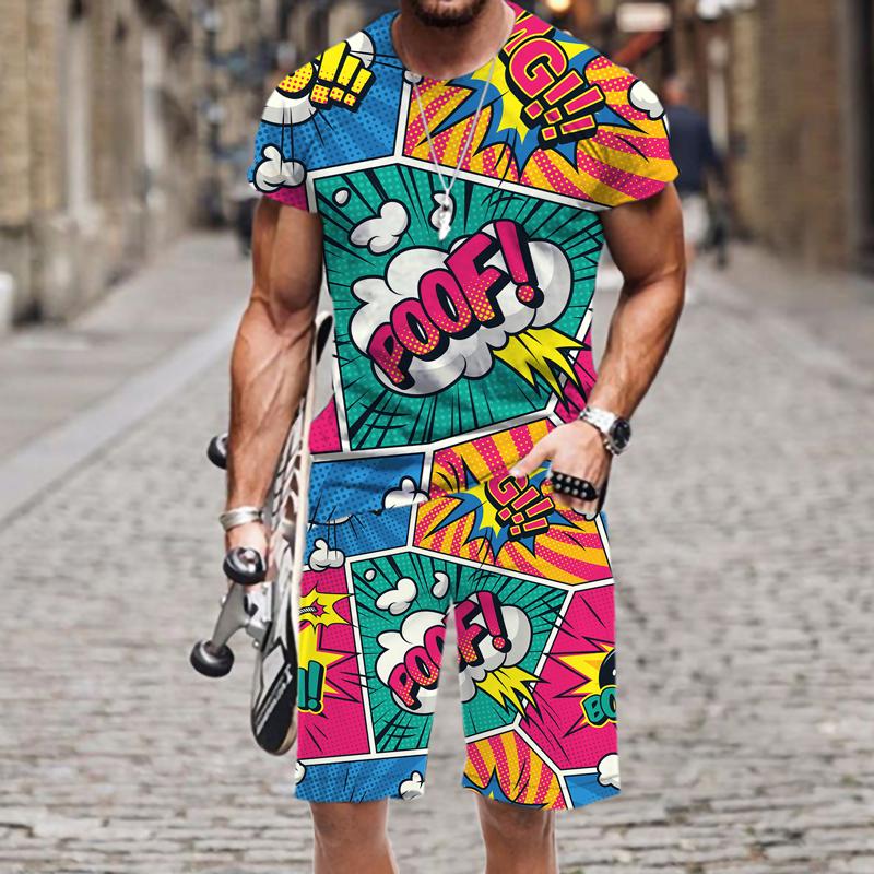 Летняя мужская футболка, комплект, забавная футболка с коротким рукавом в стиле хип-хоп, шорты, спортивный костюм из 2 предметов, красочный повседневный спортивный костюм, одежда унисекс
