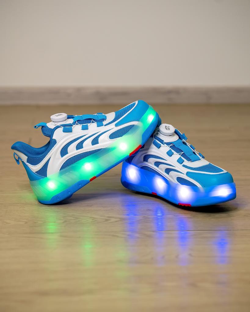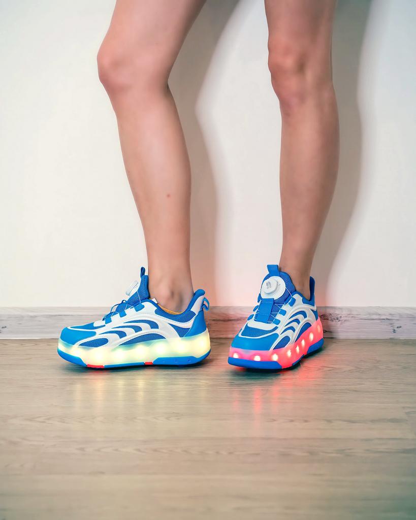 🛼 Кроссовки-ролики с подсветкой от Tuinanle Вы возможно такого ещё не видели, так что порадую:) Размеры от 35-41, т.е. от 34го ребенку тоже подойдут (потому что я лично беру на размер больше всегда себе). На 23,5 см взяла 38, мне этот размер всегда подходит. Они крутые по виду и функциональности! У меня есть роликовые коньки и теперь есть роликовые кроссовки, но т.к. я не умею нормально кататься, то в кроссовках чувствую себя значительно безопаснее) Здесь при этом нет тормозов, но можно остановиться с помощью носка или пятки. В комплекте: раздвоенный usb-шнур для зарядки (без вилки), ключ для смены роликов на заплатки, + сами заплатки на место колёс. Да, эти кроссовки могут быть как на колесах, так и на плоской подошве, так что универсальность присутствует. Кроссовки имеют затягивающуюся шнуровку (как на настоящих роликах). Надеваете кроссовок, прижимаете клапан, начинаете его крутить, он затягивает шнурки сам (шнурки представляют собой толстую леску), далее чтобы освободить ногу, надо приподнять клапан, который расслабит леску (это не очень удобно делать, но я навострилась). Помимо фич с роликами, есть крутая подсветка со множеством режимов: как мигающие радужные, так и одноцветные, а так же постоянно светящиеся одним цветом, всего их аж 16 штук. Включаются, выключаются, переключаются режимы на кнопочку, которая спрятана внутри кроссовок. И этот переключатель не мешается при ходьбе, не давит ни на что. Светятся кроссовки по времени довольно долго, по моим подсчетам около 4,5 часов! Заряжаются кроссовки недолго, в районе часа (но это не точно, т.к. не засекала, но недолго вроде). Кроссовки плотные, тяжеленькие (за счет светодиодов, аккумуляторов внутри и пр), теоретически на постоянную носку можно их носить. Я сейчас работаю фотографом в одном общественном комплексе, и заметила что они скользковаты на плитке (я поносила их в канун хэллоуина с подсветкой, радовала посетителей и администрацию). Так что если в помещениях их носить, то осторожно, чтобы нигде не подскользнуться, особенно там где встречается мокрый пол. Кроссовки очень крутые, и покататься и сходить в клуб/на мероприятие/на детский праздник очень даже годные! Есть три расцветки: белые, розовые и синие, как у меня! Горячо рекомендую!