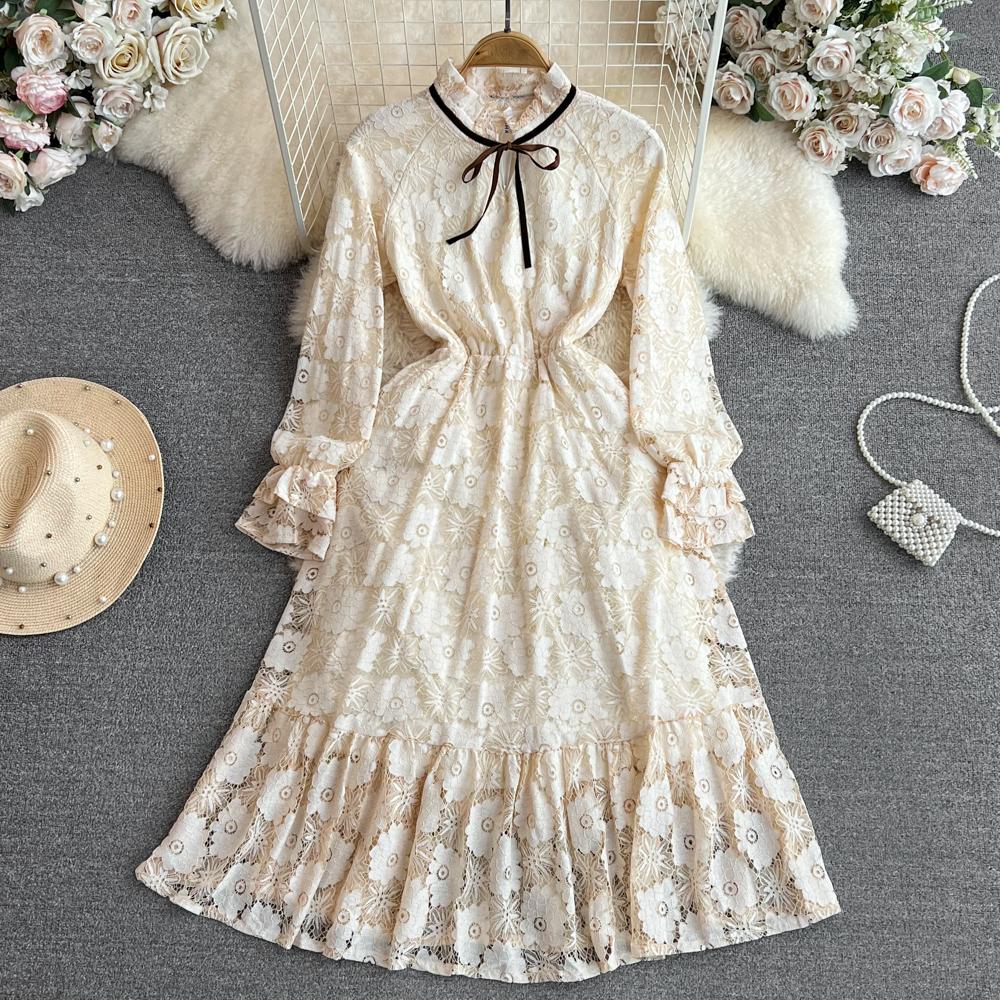 Весенне-осенние женские винтажные повседневные платья с воротником-стойкой бежевого цвета с длинными рукавами