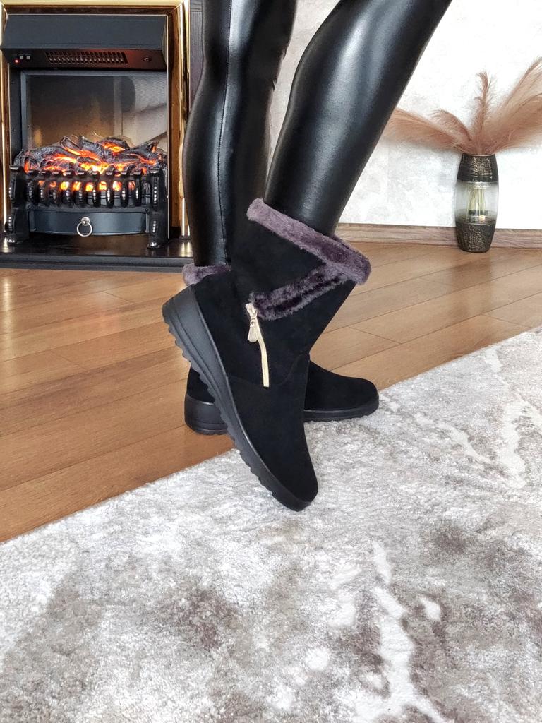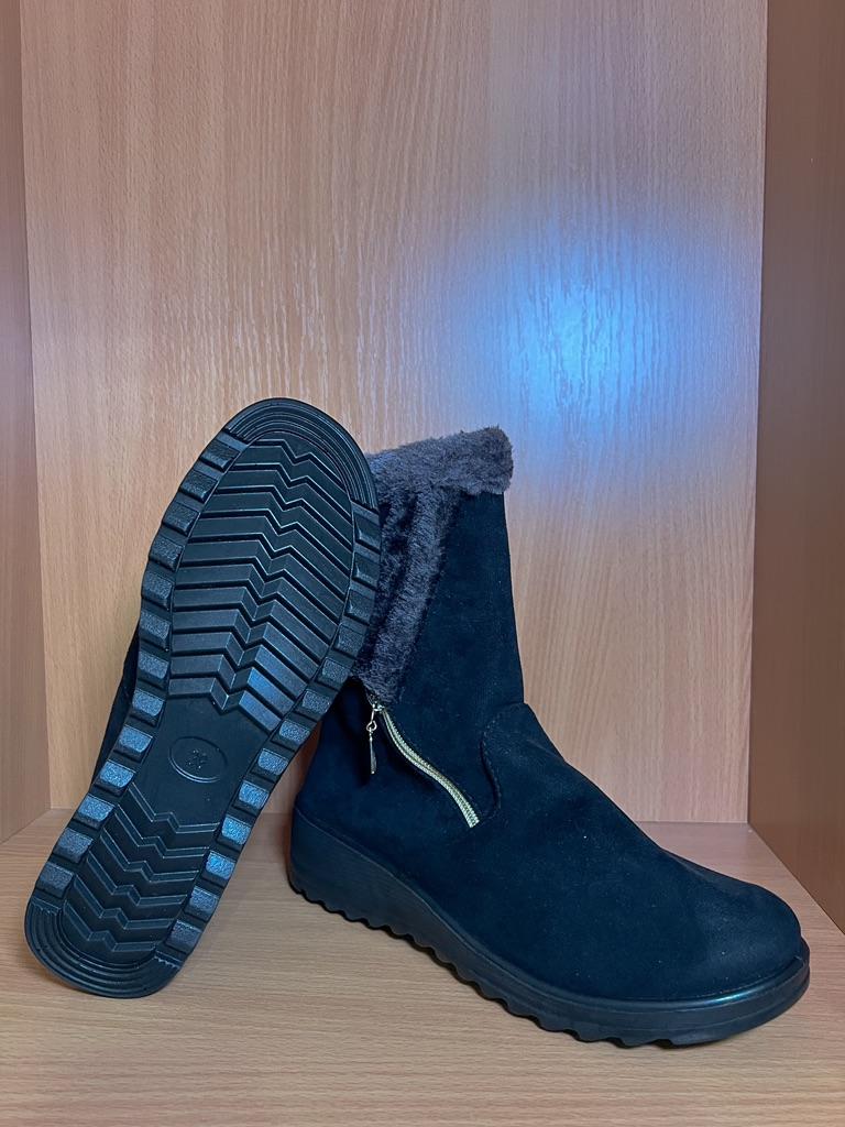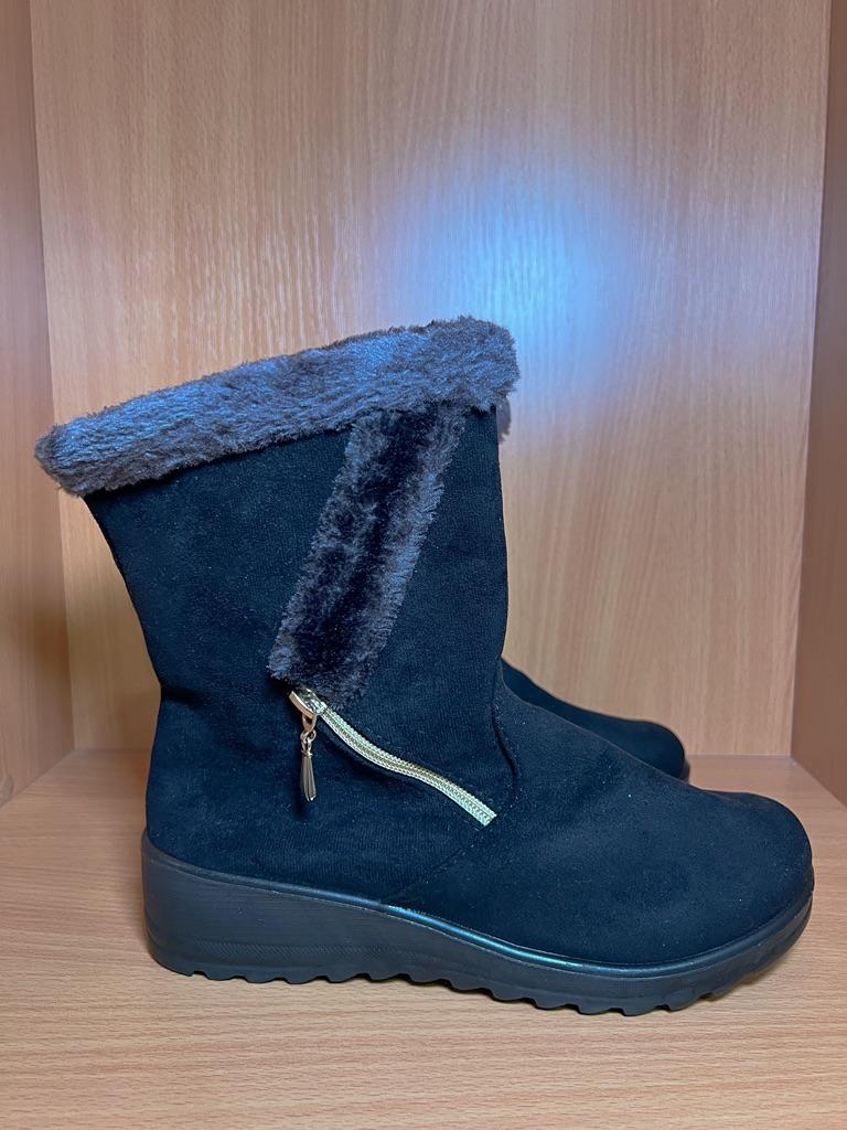Еще одни сапожки в черном цвете. Верхний материал из искусственной замши, приятный на ощупь. Подошва легкая. резина. Внутри искусственный мех, отлично греет ноги и сохраняет тепло. Сбоку декоративные элементы в виде золотых молнии и замочков. Пришли в пыпурчатом пакете. Не деформированы, форму держат! На стопу 24,5 см взяла 39 размер. Российский размер 37, 5. Все подошло! На выбор 3 цвета: черные, красные и коричневые. Рекомендую посмотреть еще в коричневом оттенке.