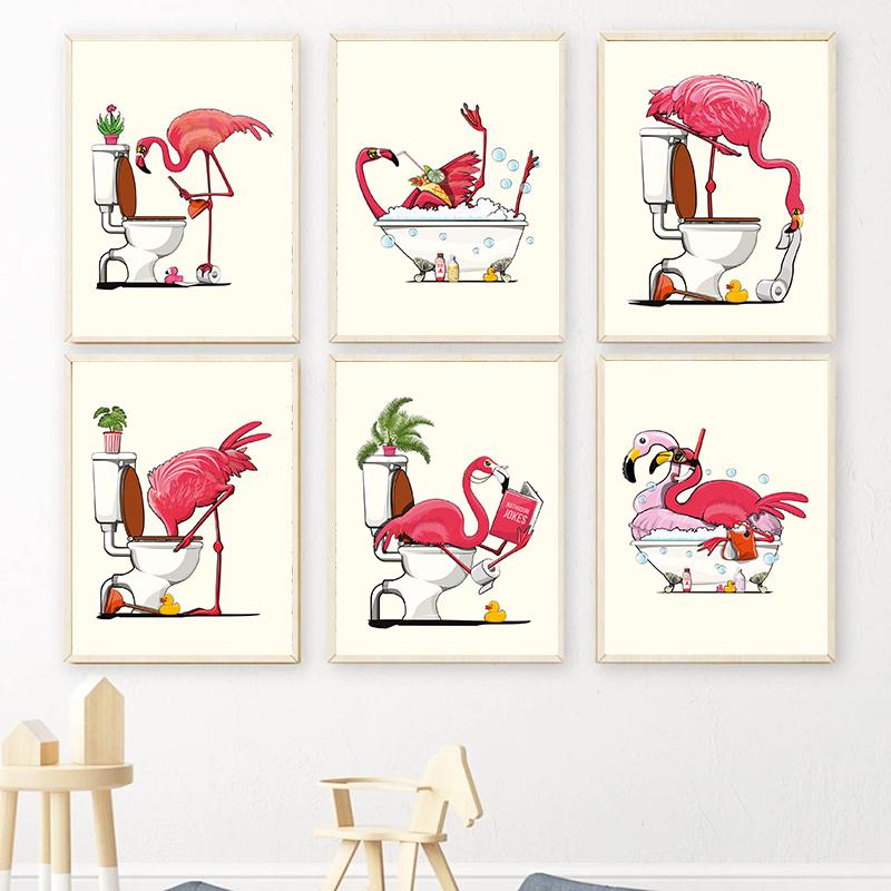 Забавный розовый фламинго с головой в туалете, постеры, холст, картина, скандинавское животное, настенная художественная картина для современной ванной комнаты, украшение для дома