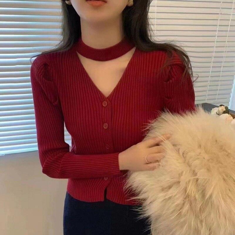 Корейский модный кардиган с v-образным вырезом на шее, женские вязаные топы, осень-зима 2023, свитер во французском стиле с пышными рукавами, одежда 28990