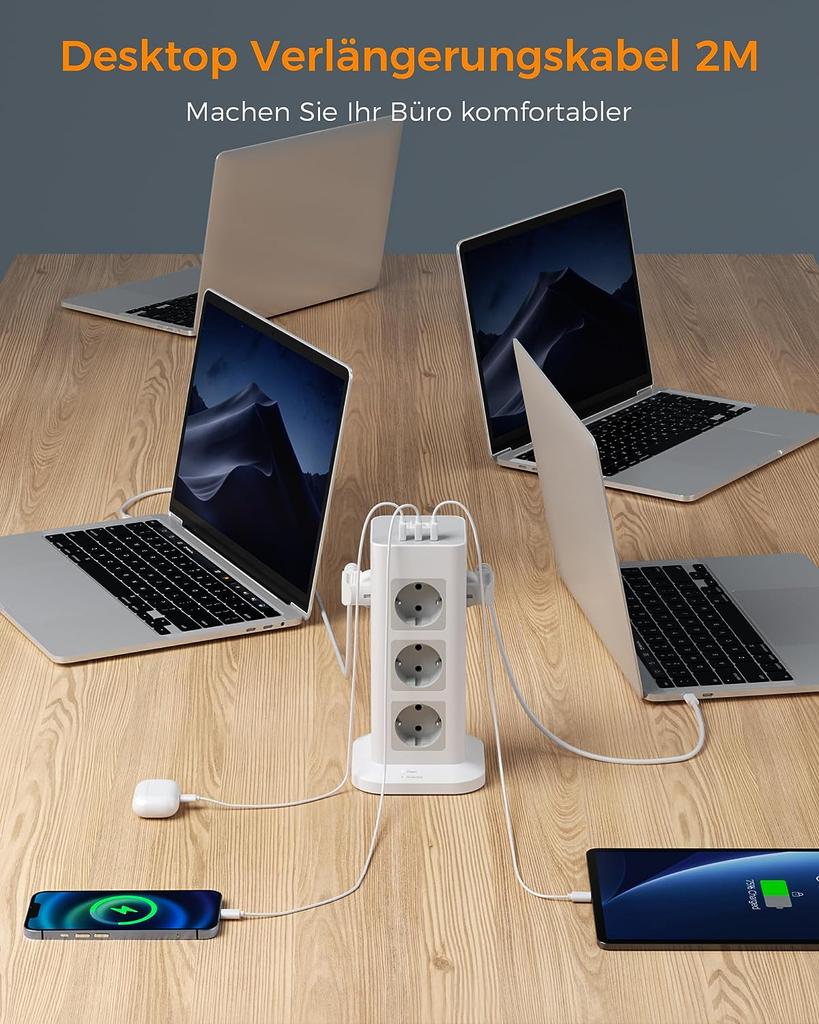 Несколько разъемов с 8 гнездами вертикальны на 4 поверхностях, экономят место, чем обычные несколько вилок. Разветвитель питания с 3 USB покрывает потребности в зарядке вашего домашнего офиса.