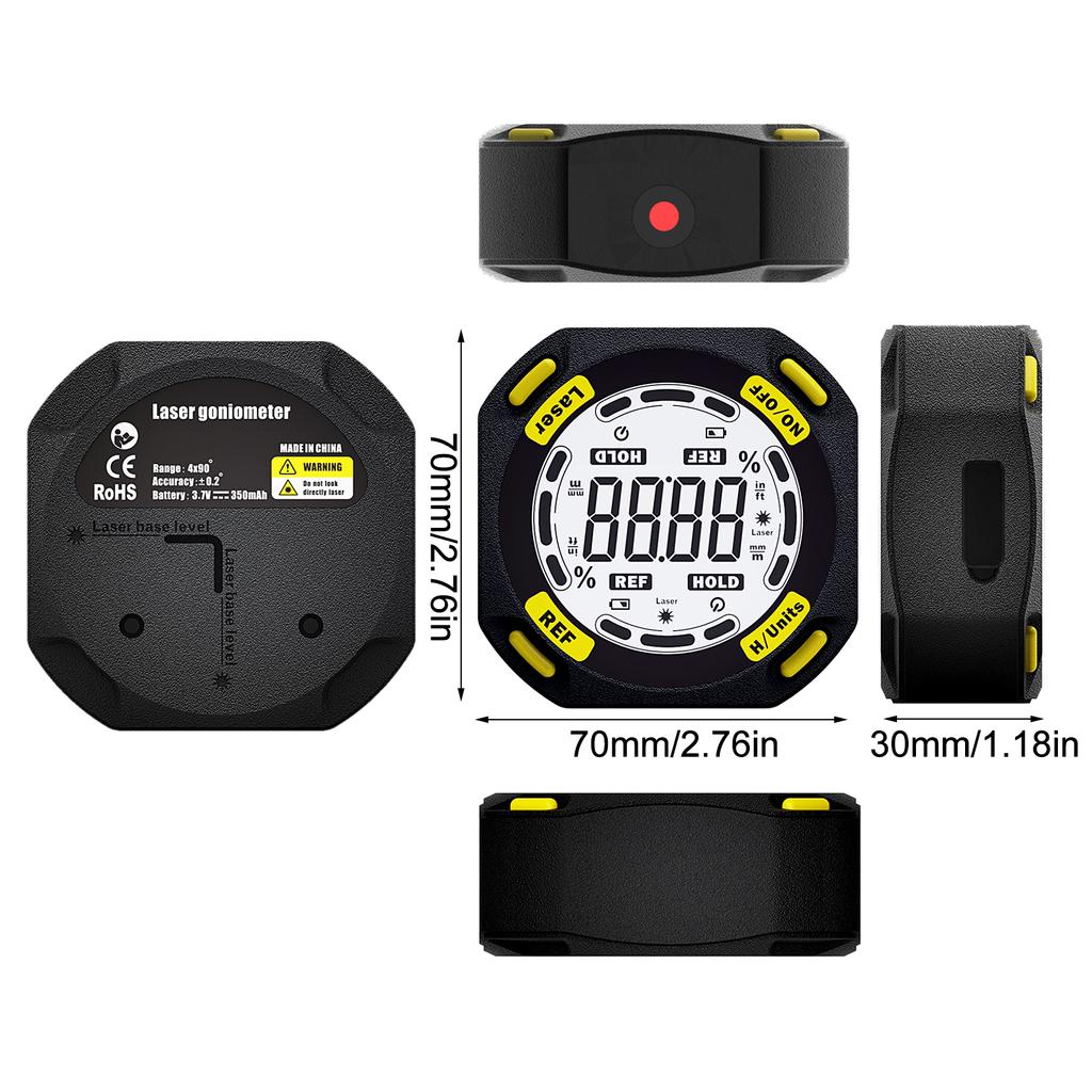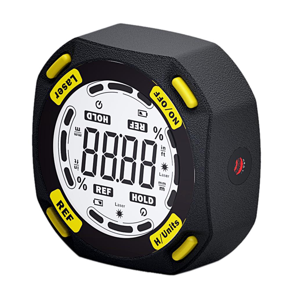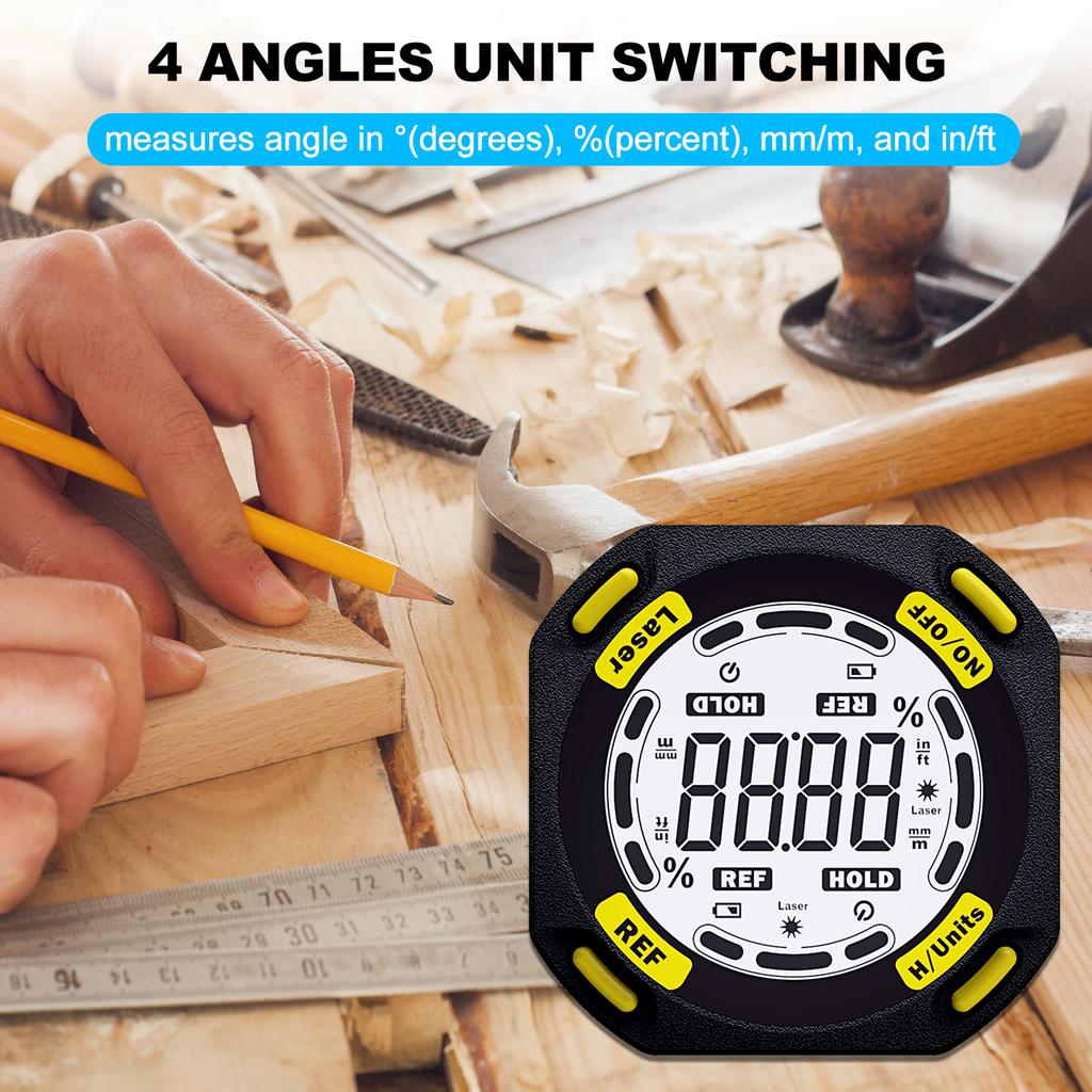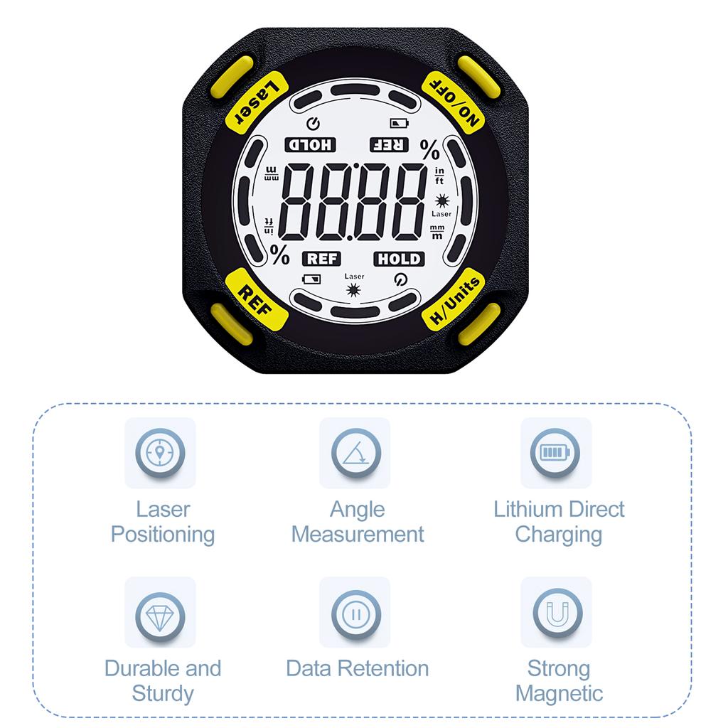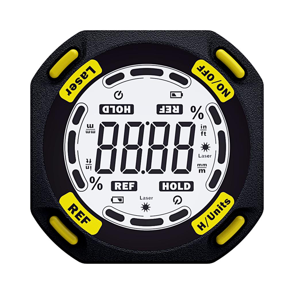 4 угла переключения блока: измеряет угол в градусах (степени), процент (процент), мм/м и дюйм/фут. 5-дюймовый ЖК-дисплей с подсветкой и автоматическим реверсом чтения для облегчения чтения.