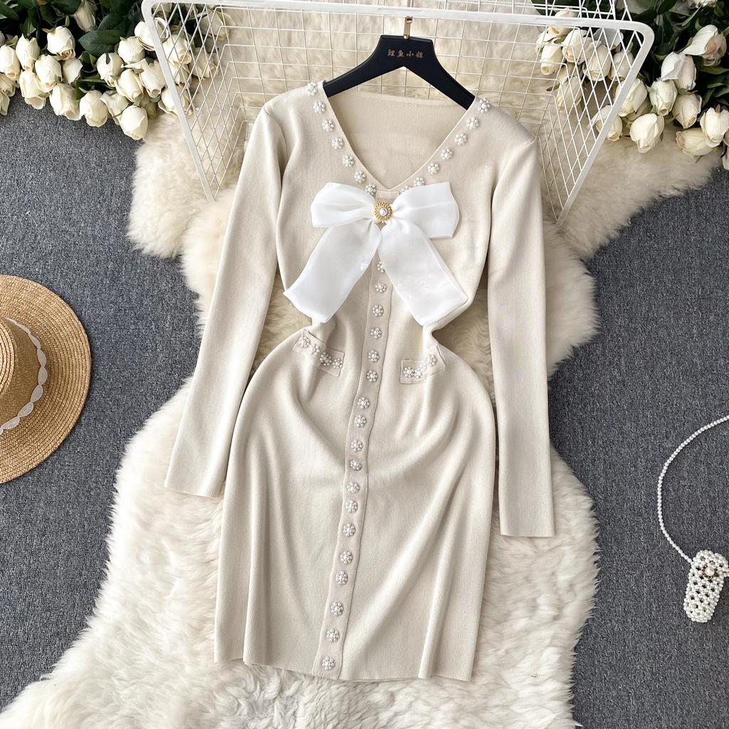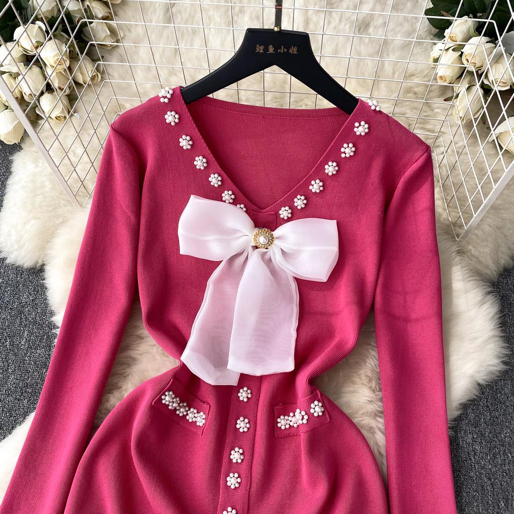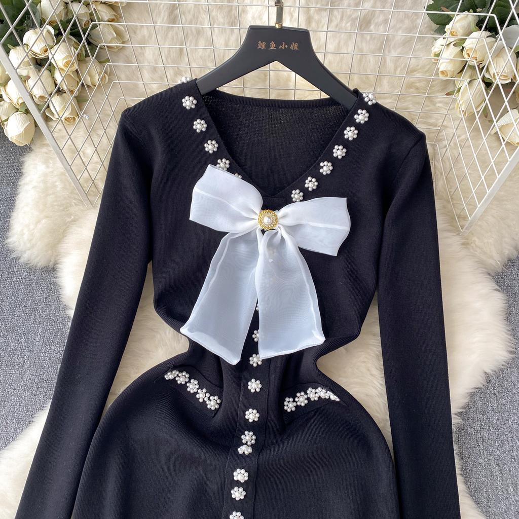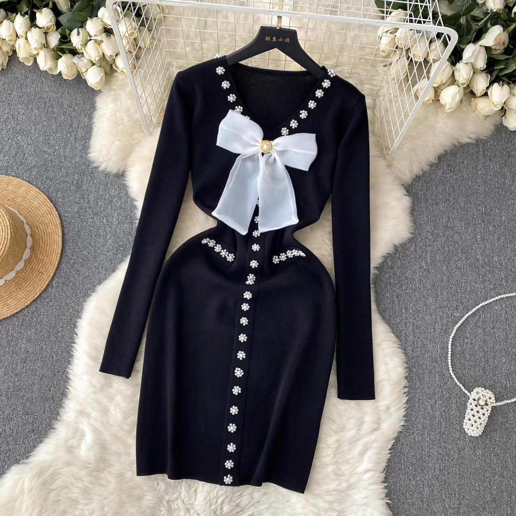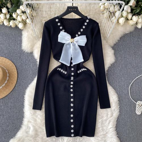 Элегантное модное облегающее платье с бантом и высокой талией, сексуальное вязаное эластичное облегающее платье с длинными рукавами, осенне-зимнее платье-свитер-карандаш