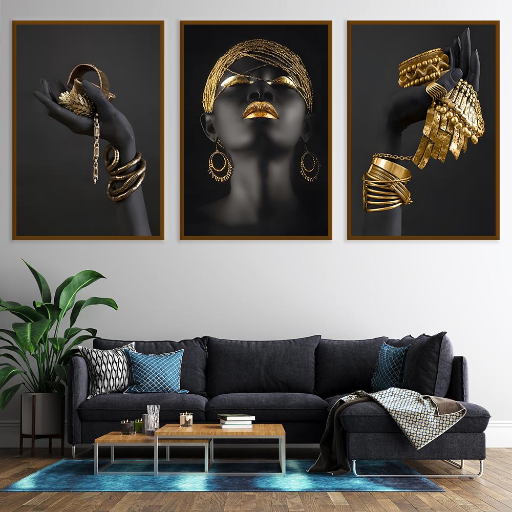 Африканский женский домашний фон, настенная живопись на холсте, золотые и серебряные украшения, ручная печать плакатов, картина для комнаты