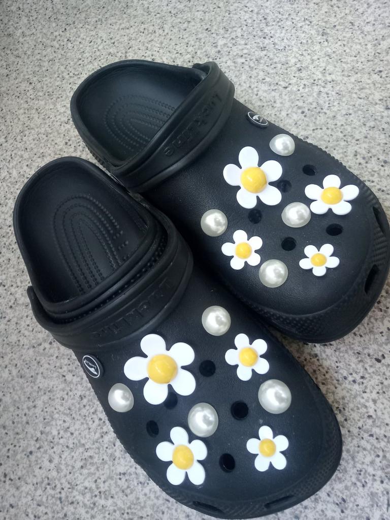Очень сложно впихнуть белые бусины в дырки на кроксах, очень твёрдые, увы не смогла и отложила