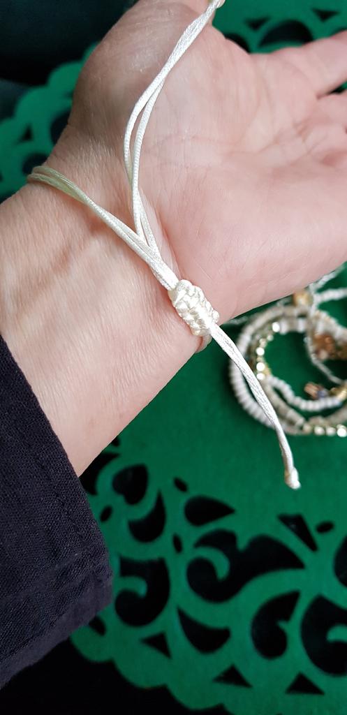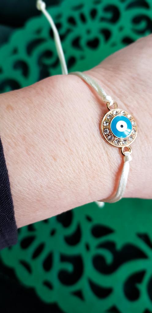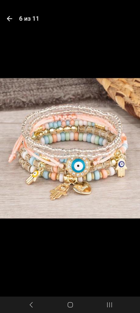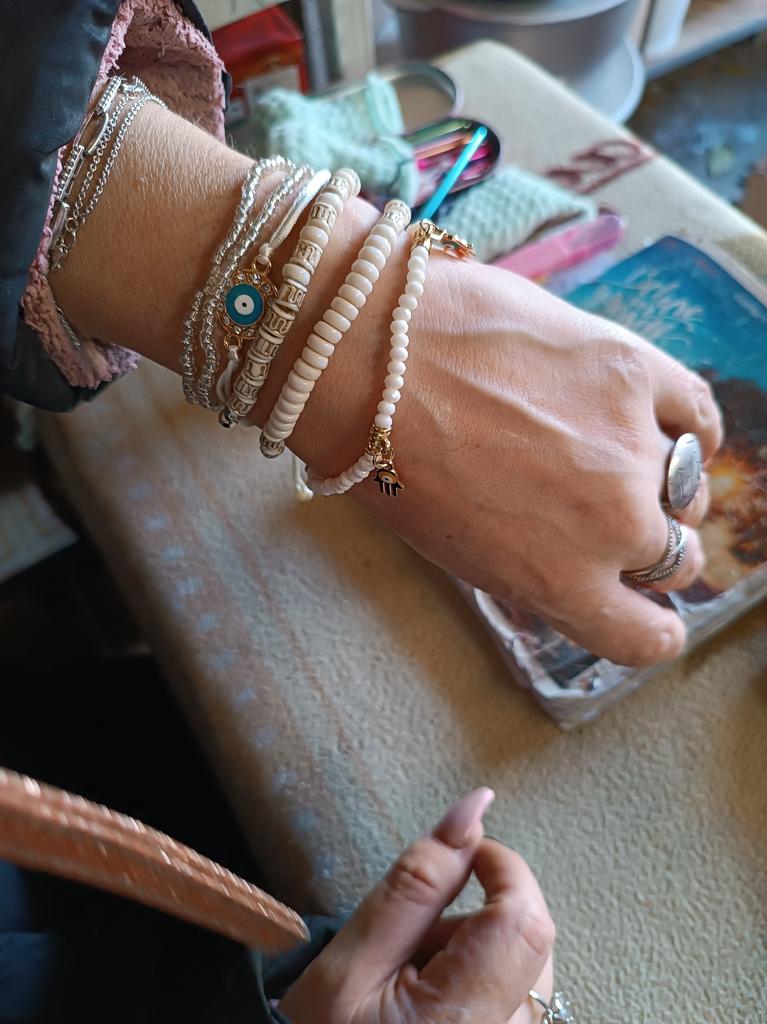Браслет-оберег из шести бус, цвет белый с золотом. Один из элементов сделан из шелковой нити, он регулируется по объему, на нем Глаз Фатимы - мощный оберег, защищает от сглаза и еще много отчего. Также есть несколько оберегов Хамса (ладонь), тоже защищают владельца. Браслет понравился смотрится очень красиво, то что хотела, ждем лета, только браслет на тонкое запястье. У меня 15,5 см, некоторые жмут, в остальном рекомендую