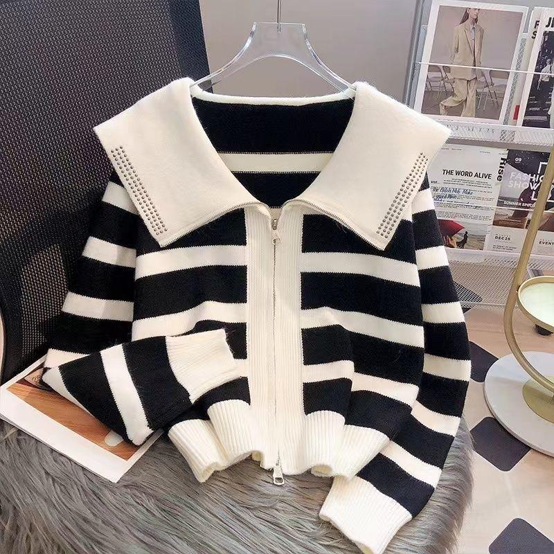 Свитер женский вязаный кардиган с кукольным вырезом женский 2023 осень новый свободный топ в полоску на молнии кардиган с длинным рукавом женский свитер пальто