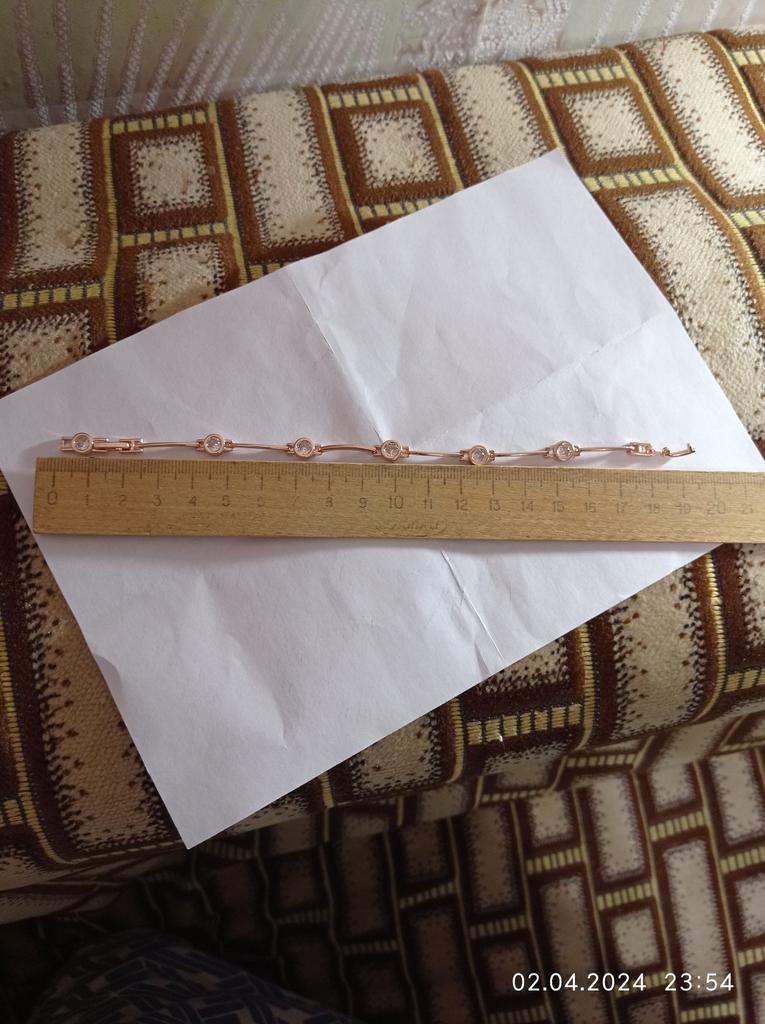 Наконец пришла долгожданная посылка! Браслет просто замечательный! Похож по цвету на золото. Очень порадовало, что его можно укоротить. У меня узкие запястья, поэтому это просто находка для меня! Просто отстёгивается одно звено и оно тоже с застёжкой. А если его одеть на цепочку, получается очень миленькая подвеска. Конечно трудно сказать, как долго будет цвет держаться. Но в общем я очень довольна, рекомендую без сомнения! Размеры можете посмотреть на моих фото. Первое это целый браслет, второе - сняла звено. Спасибо продавцу и удачных продаж!