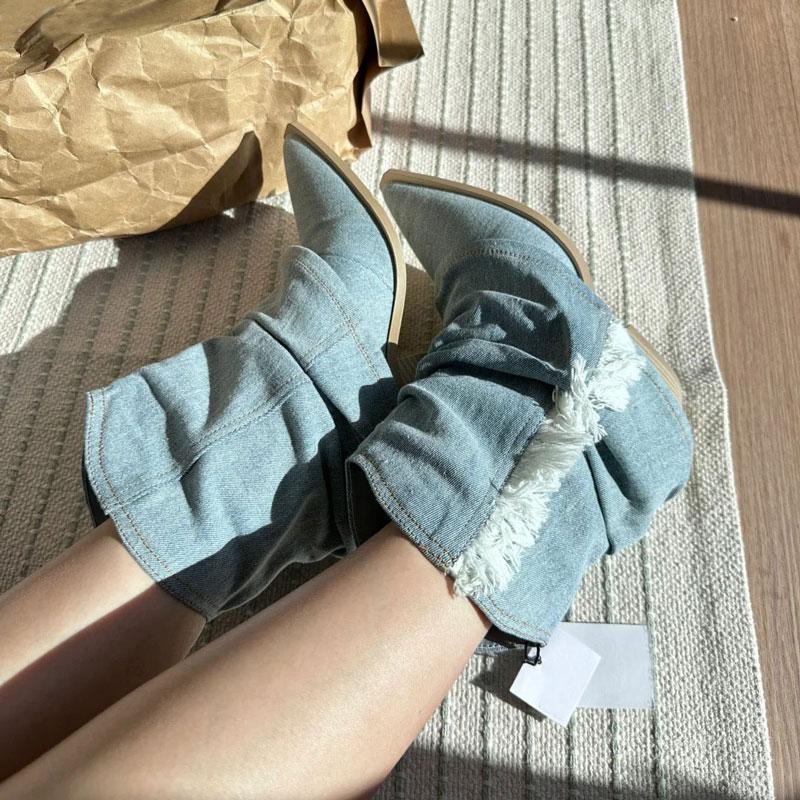 Синие джинсовые сапоги до бедра со складками для женщин, осень 2023, ковбойские сапоги с острым носком на толстом каблуке, женские длинные сапоги в стиле вестерн без шнуровки