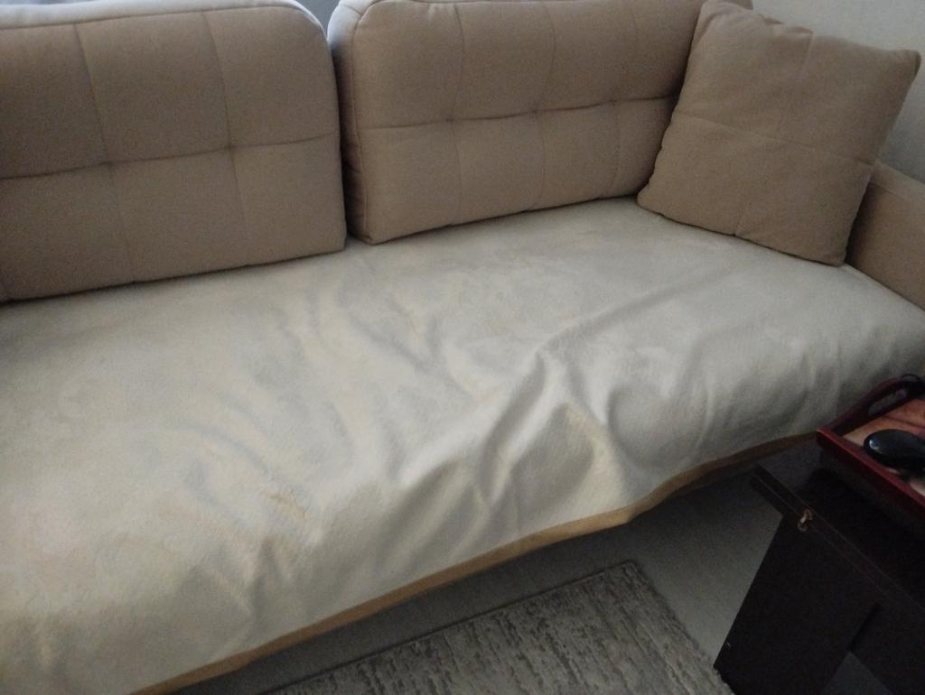 Приятный плотный материал. Минус один--после того, как посидишь на диване, приходится поправлять все заново, т. е. скользит.