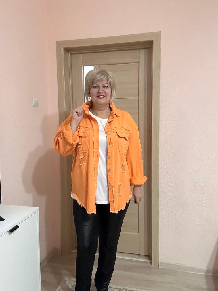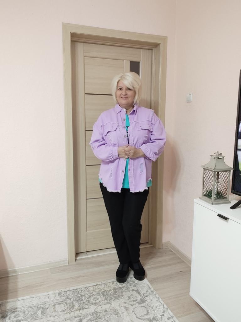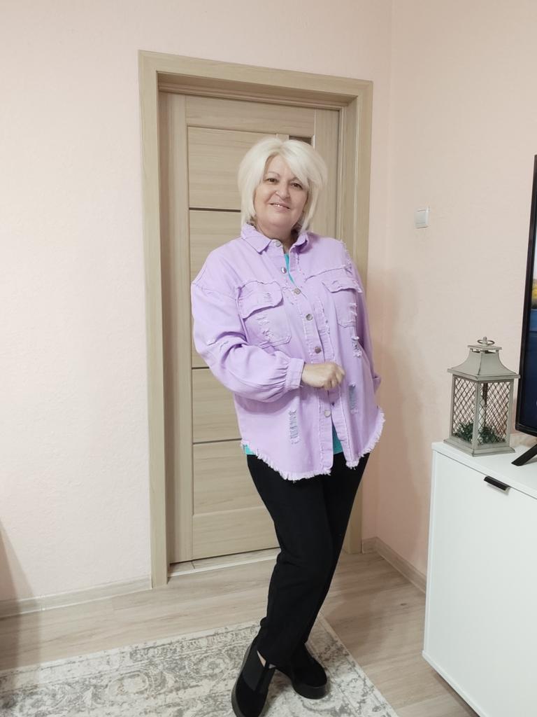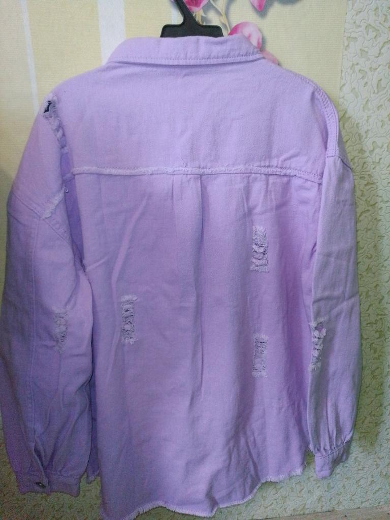 Модная рубашка!😍 ✔️ Рубашка с драниной на металлических пуговицах, в нежно лавандовом цвете, есть два кармана с клапанами на пуговицах. ✔️ Рубашка смотреться особенно хорошо с футболкой или топом . ✔️ Материал джинс приятный тактильно. ✔️После деликатной стирки изменений нет. ✔️ На мне размер XL подошла с хорошим запасом. ✔️ Размерный ряд с S до 2XL соответствует описанию продавца. ✔️У продавца больше цветов на выбор. ✈️Посылка шла около десяти дней в Молдову-Кишинёв ✔️Посылка была упаковано отлично. ✔️Нитки не торчат. ✔️Нет неприятного запаха. ✔️Дизайн интересный. ✔️Качество хорошее. Мои параметры: Рост - 1,65 см. ОГ - 110 см. ОТ - 100 см. ОБ - 115 см. Однозначно рекомендую к покупке 🥰