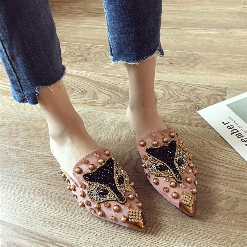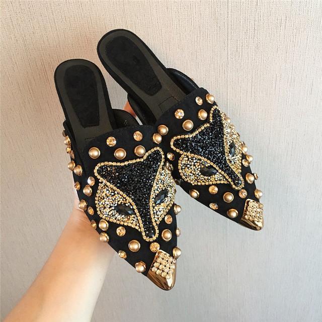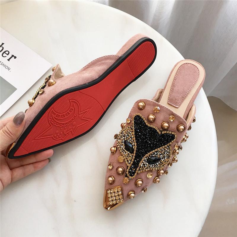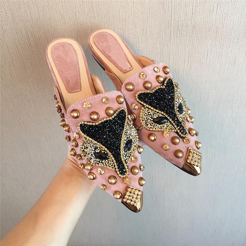 Летние женские тапочки на плоской подошве с острым носком, новинка, черные, розовые туфли со стразами, роскошные брендовые туфли-лодочки, женские шлепанцы на открытом воздухе