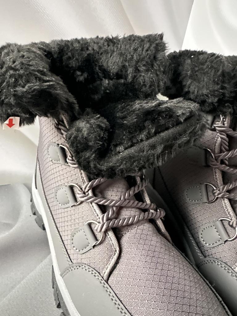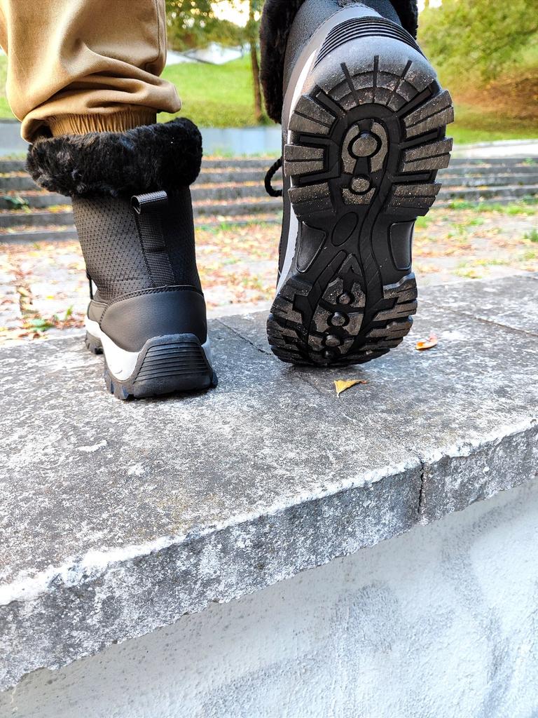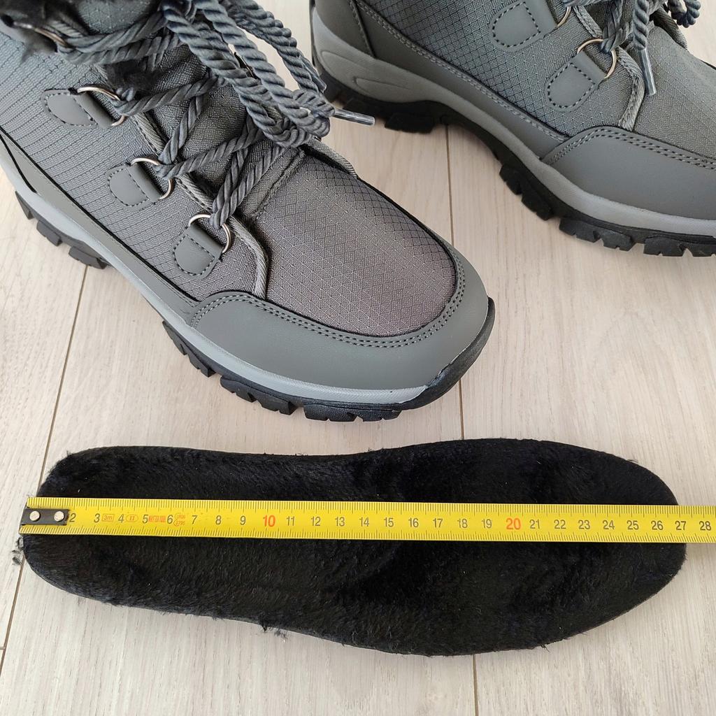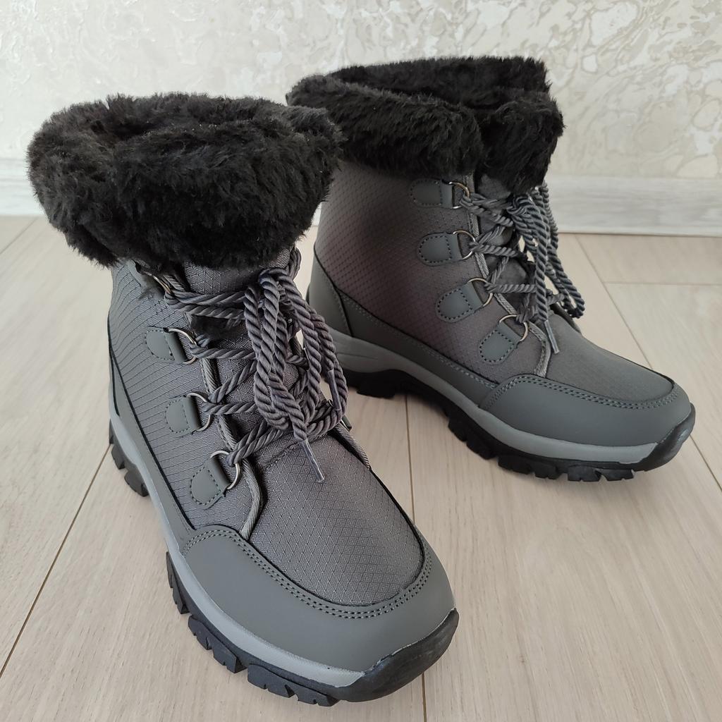 Тёплые и удобные зимние сапоги, модель унисекс, широкий размерный ряд. Доставка заняла чуть больше месяца до почтового отделения Укрпочты, сборная посылка Joom. В магазине на выбор 3 варианта расцветки сапог, я выбрала серые, смотрится отлично. На стопу 26 см, я заказала размер 42, сапоги подошли отлично, даже есть запас, измерения стельки: 27 см, но рекомендую на стопу 26-26,5, внутри густой мех, должен быть запас. Внешний материал водоотталкивающий текстиль, а по кругу вставки из ПУ кожи. Внутри густой плюш, отличный и тёплый зимний вариант. Сапоги на шнуровке, молнии нет, но я их не шнурую туго, поэтому на узкую ногу могу обувать не расшнуровуя. Шнуровка очень необычная, металлические петельки, добавляет изюминку дизайну. Подошва достаточно высокая, резиновая, не скользкая, рельефная, что очень важно для гололёда. Для меня эти сапожки - идеальный зимний вариант, они не только тёплые и удобные, а ещё и отлично смотрятся на ноге, гулять зимой с ребёнком - идеально. Качеством я довольна, к покупке рекомендую!