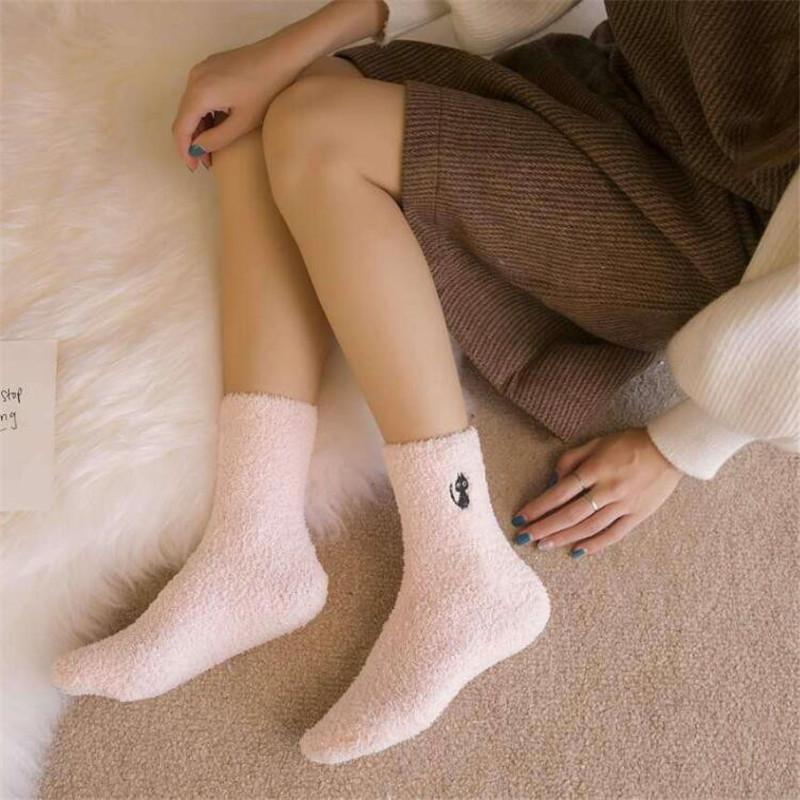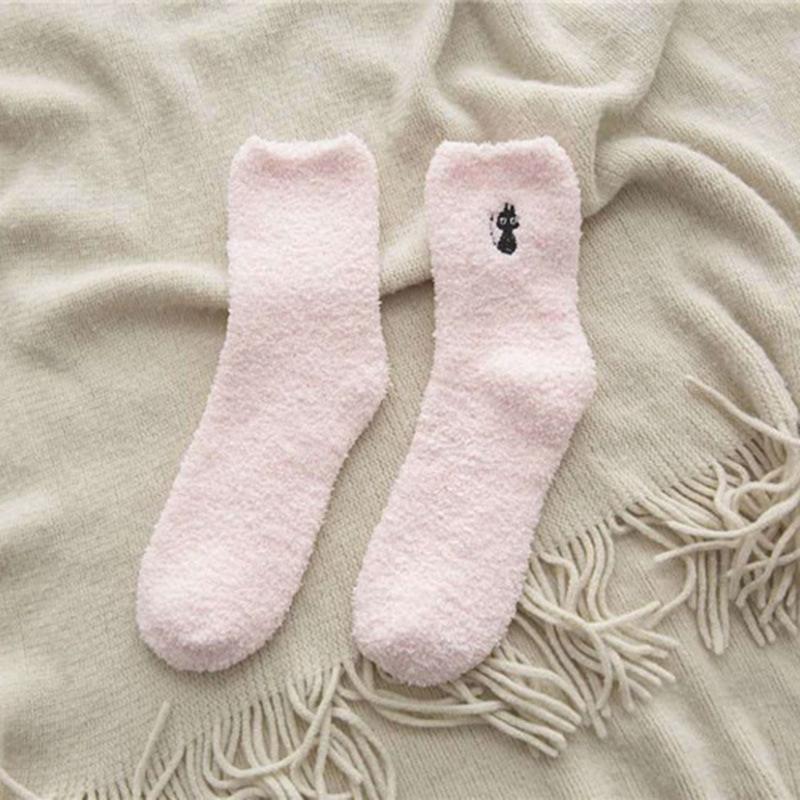 Утепленные женские хлопковые плюшевые утепленные носки с вышивкой кота, женские забавные милые носки для сна, зимние носки