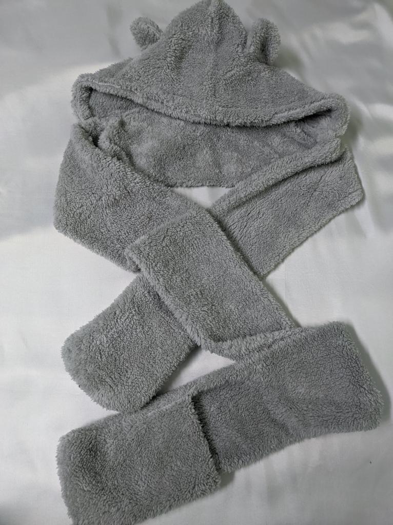Шапочка с ушками. Ну что за прелесть! ☺️ Купила для своей дочери-подростка, и радуюсь вместе с ней от души! Это первая шапка, которую она носит с удовольствием, и я теперь совершенно спокойна за её уши. Знаю, что зайдя за угол дома, она не снимет шапку и не спрячет её в карман куртки.😁 Если быть точной, это не просто шапка. Это - три в одном: шапка-шарф-варежки. Шапка - "капюшонного" покроя, с милыми ушками сверху, пришита к шарфу длиной 110 см, шириной 13 см, на краях шарфа - кармашки-варежки. Сшито это великолепие из мягкого мохнатого флиса. И шапка, и шарф - двойные. Шарф пришит к шапке ассиметрично, с тем, чтобы длинным концом обернуть шею. У продавца на выбор четыре цвета, мы выбрали серый. Вещь, которую рекомендуем очень охотно! 😍 ⭐⭐⭐⭐⭐