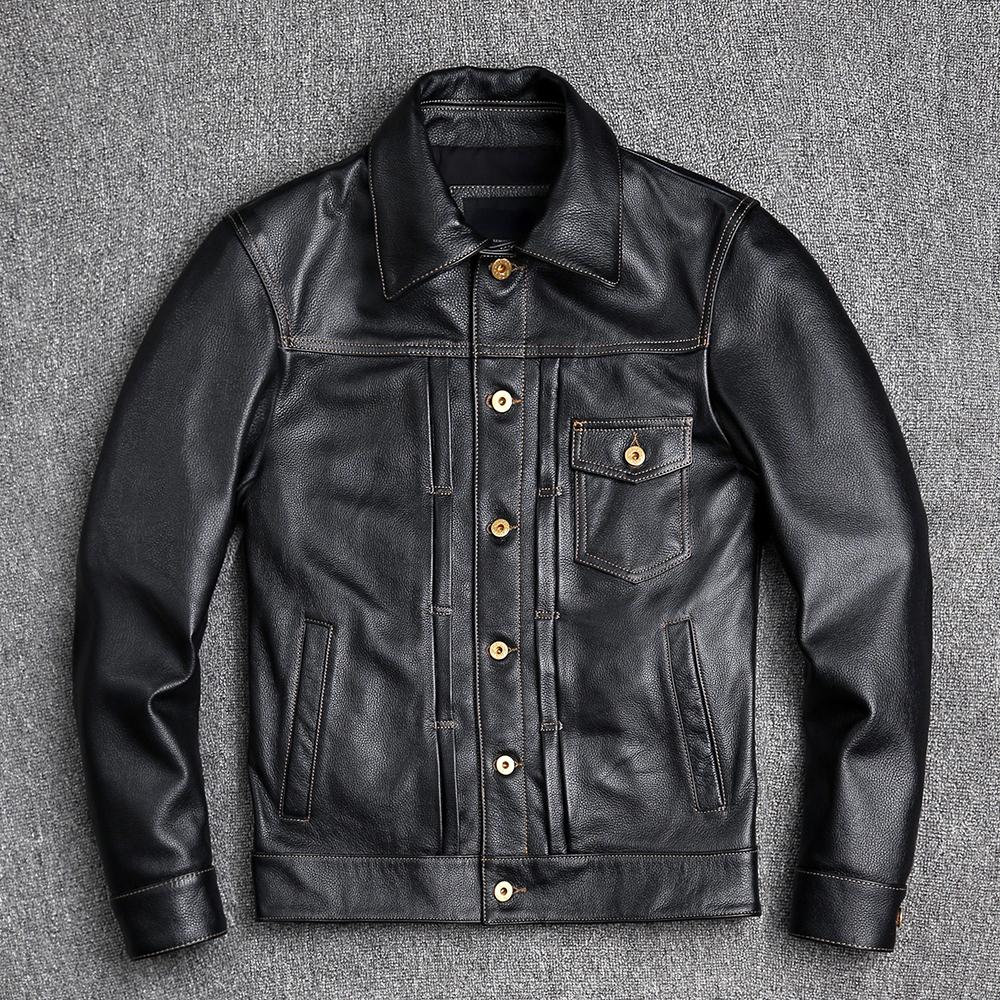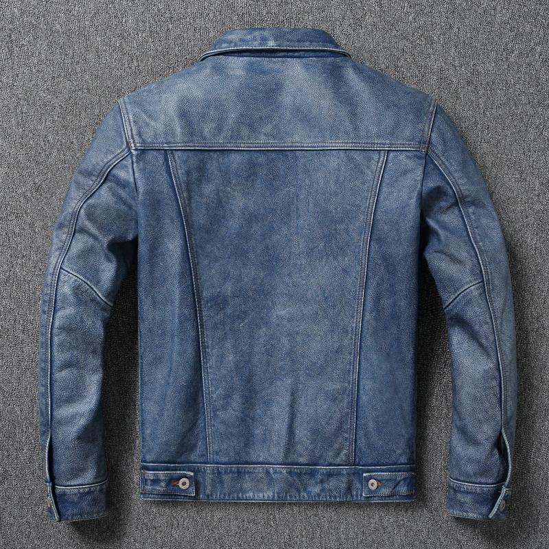 Винтажная синяя мужская кожаная куртка из натуральной яловой кожи, короткое пальто, рабочая одежда с тонкими лацканами, куртки из натуральной телячьей кожи