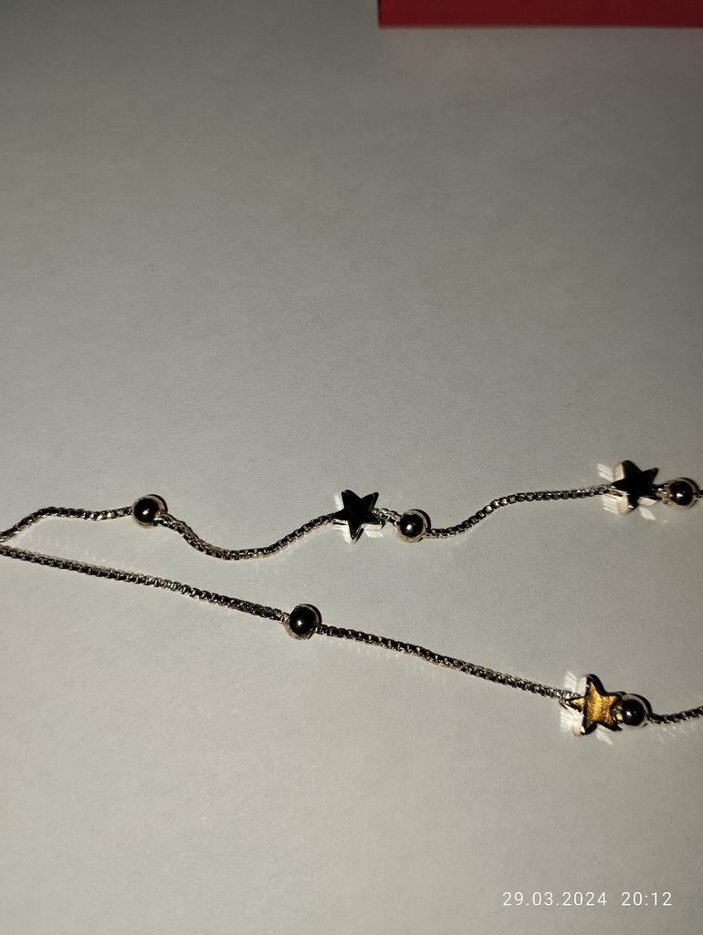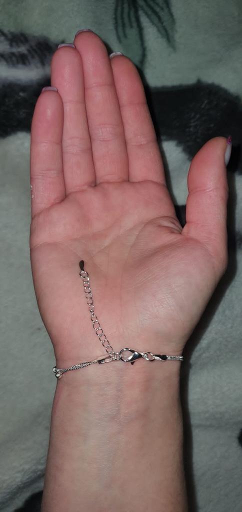 Он такой нежный и блестящий! Я никак не могла найти ракурс,чтоб показать его во всей красе. Верьте на слово😉 Похож на серебро,но понятно,что за такие деньги серебро не продаётся. Носить буду ближе к лету. Будет ли он облазить,не знаю,посмотрим. Еще лет 5-6 тому покупала бижутерию и она сейчас вся в мусорнике. Года 3 тому покупала браслет с камушками,то могу похвалить,слава богу не облазит,но и я его не часто ношу. Фото его рядом с новеньким браслетиком.К покупке рекомендуется, Если и облезет,не печальтесь,купите себе другой😉 Спасибо продавцу за такую красоту. Прошу заметить,он идет на тонкую руку,но из-за дополнительных звеньев его можно "расширить".