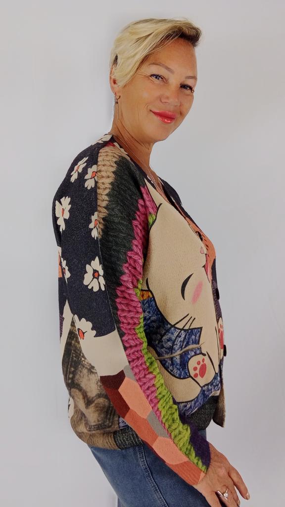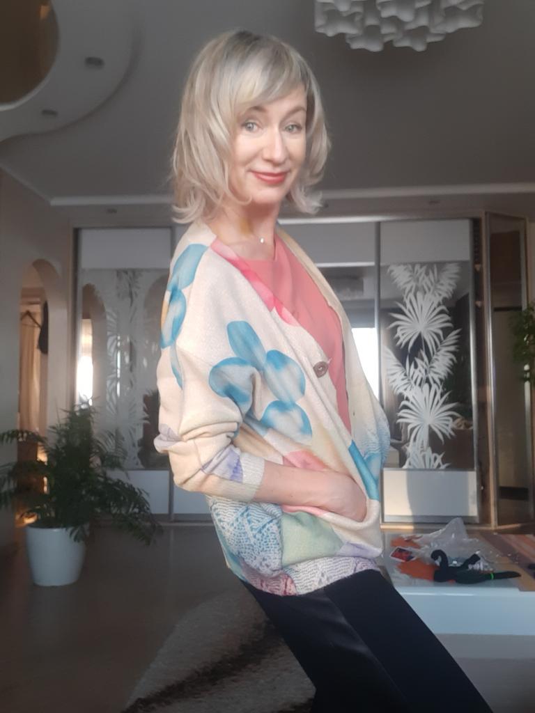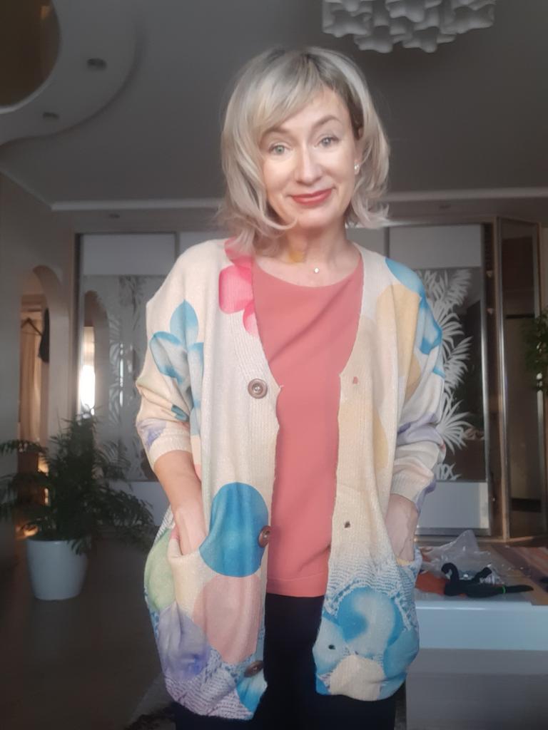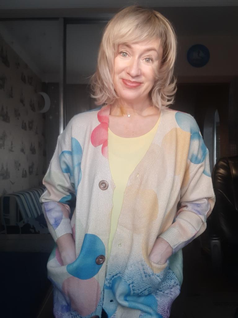Кофточка понравилась! Присмотрела ее у Натальи Великой. По размеру- свободна, оверсайз, так как мой объем груди 106 , здесь большой запас. Расцветок очень много, на любой вкус. Выбрала крупный рисунок, где представлены различные цвета от синего, фиолетового, зеленого до желтого, бежевого... Рукава тоже длинноваты- я к этому привыкла, рост невысокий 158- 159, рукав буду закатывать ... Трикотаж не очень толстый, приятный к телу. Очень мягкий!!! Снимать не хочется- настолько приятен к телу! Некоторые кофточки напрягают, что без майки носить невозможно, колются...Есть карманчик небольшой, что тоже радует. В общем, неординарная кофточка, не забитая, хорошего качества. Подойдет для женщин с разной фигурой: на одних будет смотреться как оверсайз, на других- по фигуре. И для невысоких, и для более высоких- подойдет. Рекомендую для приобретения! Расцветки дают большой разгон для выбора, на самые разные вкусы... Буду носить весной с джинсами, брюками разных расцветок, начиная от фиолетовых оттенков, заканчивая жёлтыми брюками.