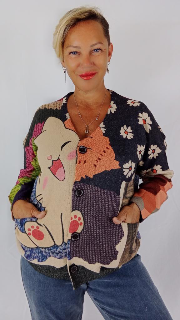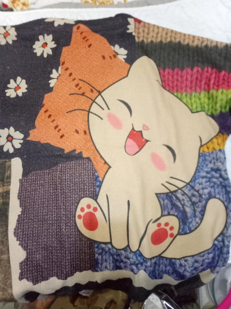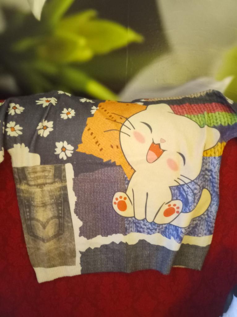Кардиган Больше обзоров, промокоды, подарки в моем телеграм канале. Жми лупу 🧐🔎, пиши @Наталья_Великая . Если не можешь найти, в любом поисковике: Яндекс, Гугл вводи: телеграм Наталья Великая . Все ссылки на товары из обзора ищи в моем телеграм канале. Семнадцать расцветок, моя первая слева. Размер единый. Мои параметры: рост 167, 100-87-102. Большая, веселая кошка напомнила мне японский аниме). Благодаря рисунку, нанесенному поверх кардигана, крупные, вязаные косы, кажутся настоящими, объемными, но это лишь визуально. С изнанки кофта однотонная, рисунок есть на груди, спине, и частично в области выреза, как будто краску наносили валиком поверх изделия). Ткань не слишком тонкая, вязаная, скорее всего, акрил. Замеры : Плечи 70 Длина рукава от горловины 70 Длина рукава 50 Пройма 46 ОГ подмышками 134 ОТ 120 ОБ 108 Длина 66. Пошив аккуратный - ни одной торчащей нитки. Этикеток нет. На моём экземпляре на одном из манжетов крошечный непрокрас.