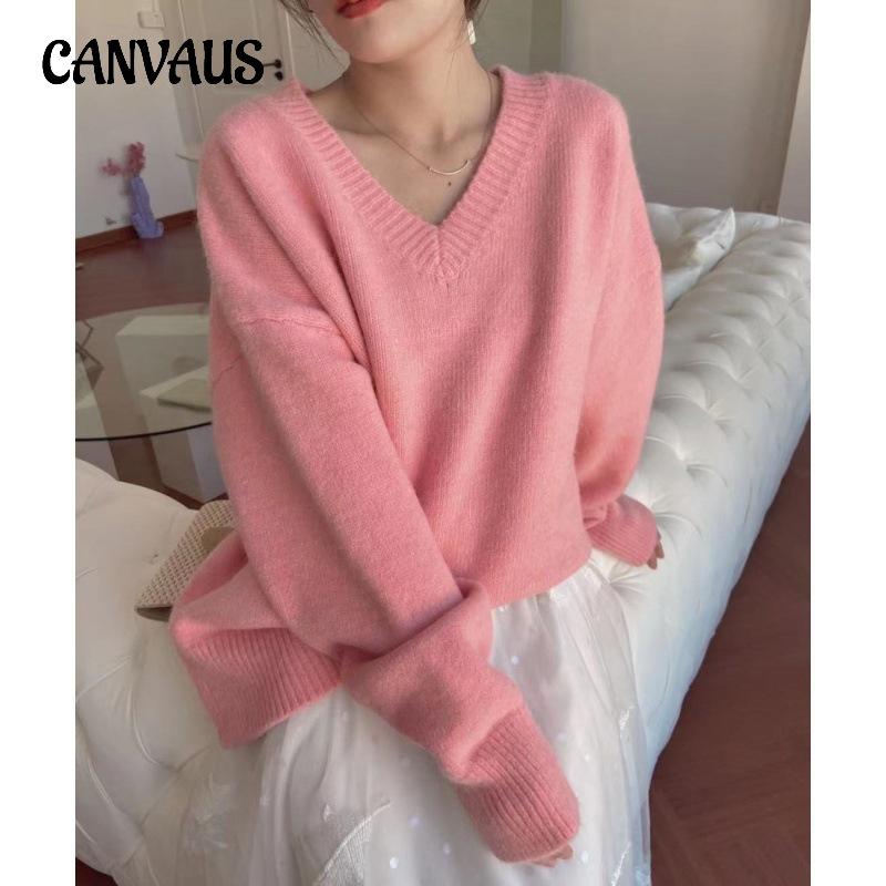 Осенне-зимний женский свитер, нежный, мягкий, однотонный, свободный пуловер с v-образным вырезом, свитер с длинными рукавами для ленивого ветра