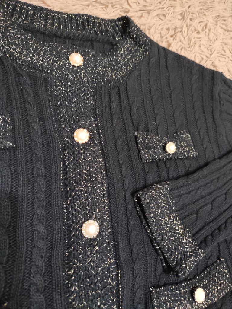 Вязаный , укороченный кардиган с люрексовой нитью на выставках и жемчужными пуговицами . Смотрится стильно . Рекомендую к покупке