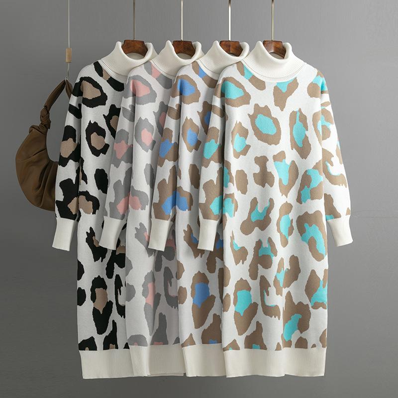 Осенне-зимнее женское длинное трикотажное платье с высоким воротником и леопардовым принтом — купить товар онлайн с бесплатной доставкой по всему миру!