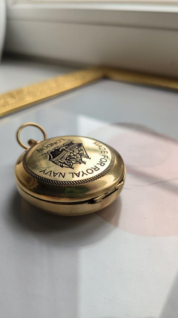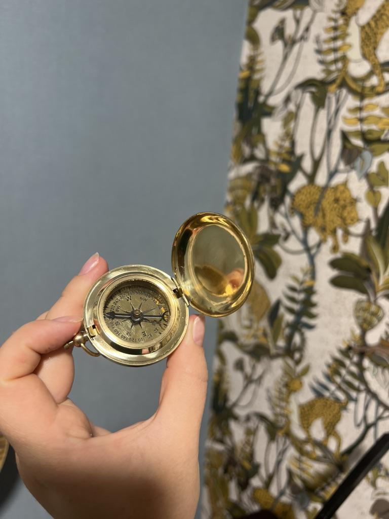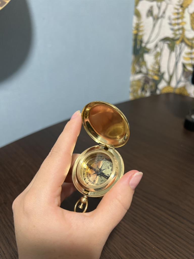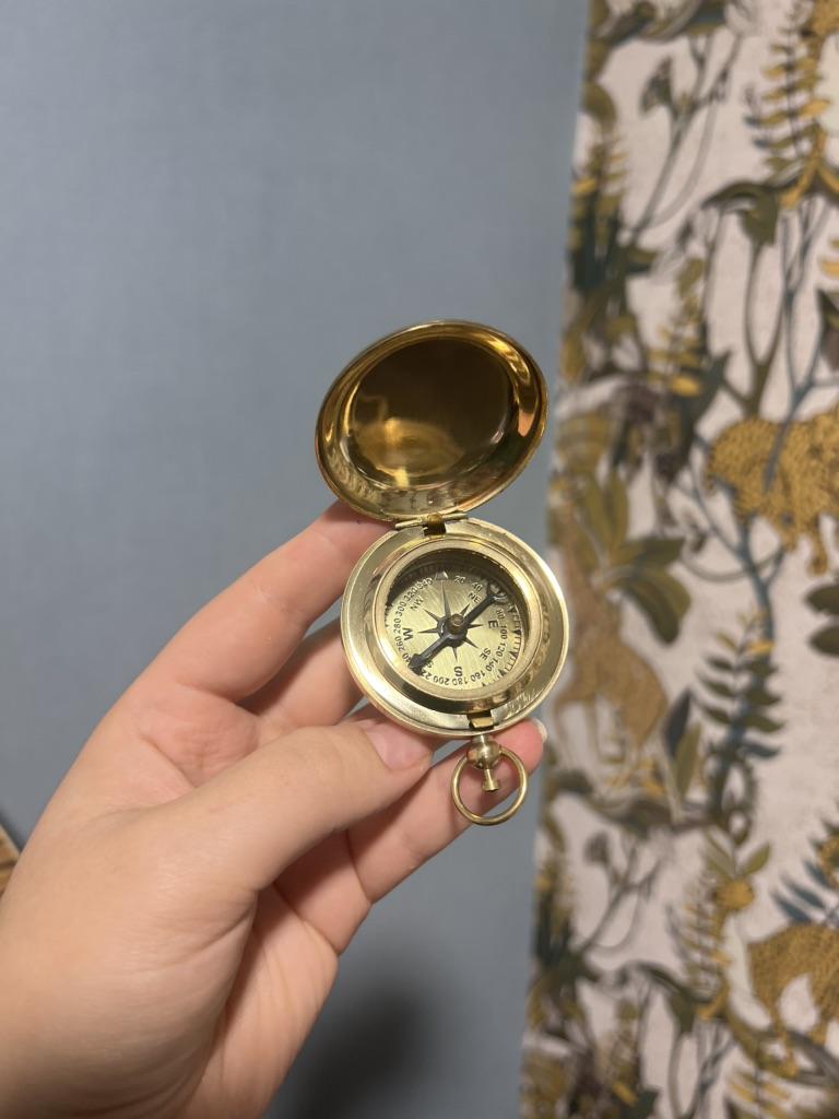 Красивейший латунный компас благородного цвета в винтажном стиле 🔥 🧭 Закрывается с красивым характерным негромким щелчком, как крутые карманные часы. 🧭 Диаметр 4,5 см. 🧭 Красивая гравировка рельефная на крышке 🤌🏽, не просто рисунок или наклейка. 🧭 Компас в рабочем состоянии, свою функцию точно выполняет. 🧭 Есть держатель, можно закрепить компас к брелку, к брюкам или рюкзаку. Очень довольна. Буду дарить брату на День рождения. Он у меня путешественник) 🧳