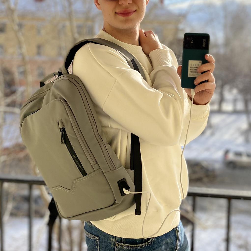 ОЧЕНЬ КАЧЕСТВЕННЫЙ РЮКЗАК с USB-зарядкой То, что нужно для гаджетомана! Рюкзак, который заряжает твой гаджет – это же просто мечта! Кроме того, он вместительный и «НЕ УБИВАЕМЫЙ». Внутри есть 2 кармана для ноутбука до 17″ и планшета. На передней стенке тоже есть несколько кармашков для всяких вещей: в верхний отлично помещается записная книжка с ручкой, а один из нижних просто создан для портативного аккумулятора. Чтобы удобно подзаряжать смартфон или планшет «на ходу», в свой портативный аккумулятор нужно воткнуть USB-удлинитель, который есть в комплекте. После этого внешний USB-разъём может подзаряжать гаджеты, это очень удобно. Разъём расположен так, что можно пользоваться им даже под проливным дождём без всяких последствий. Рюкзак надежно защищён от любых проникновений: расстегнуть его незаметно невозможно. Мой вердикт: это один из немногих рюкзаков, который хочется купить с первого взгляда.