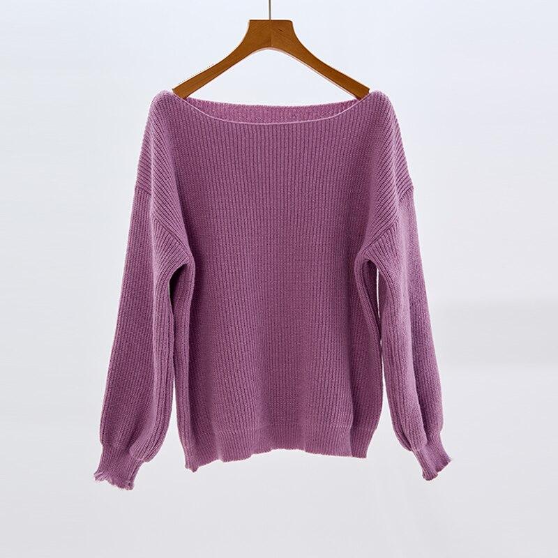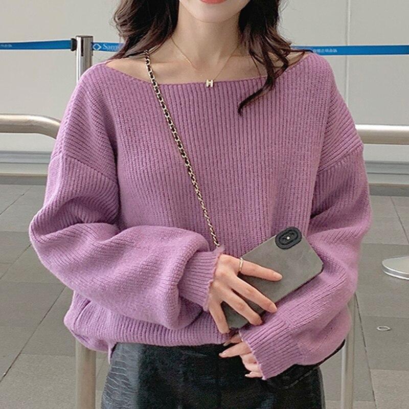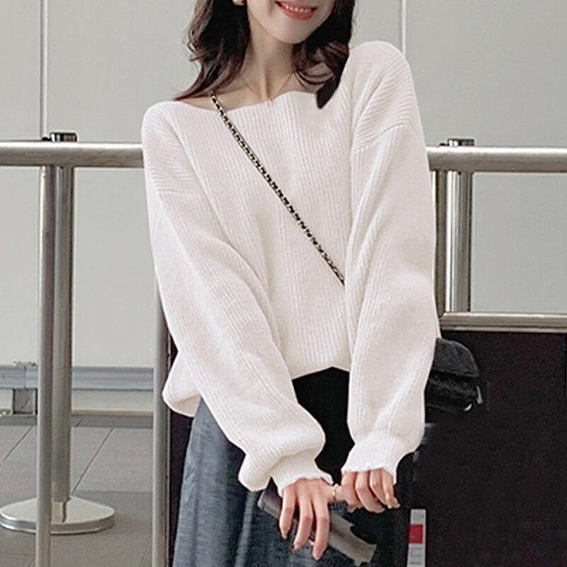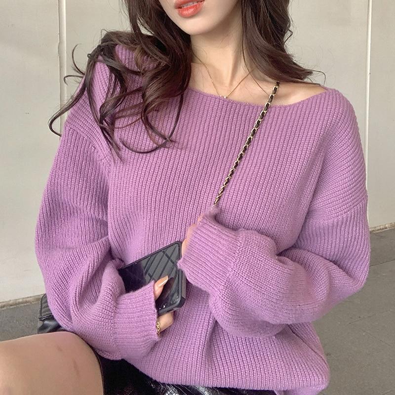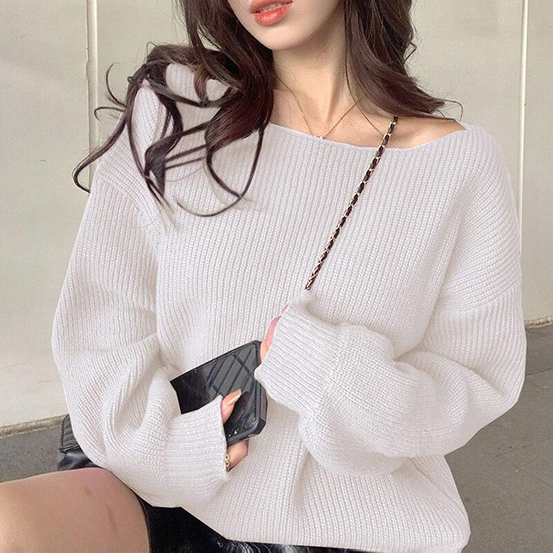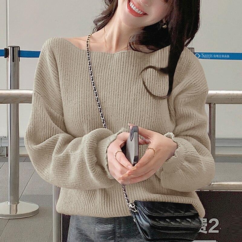 Осень-зима, простой пуловер, свитер для женщин, свободный толстый однотонный вязаный джемпер, топы 2023, свитера с одним вырезом 29089