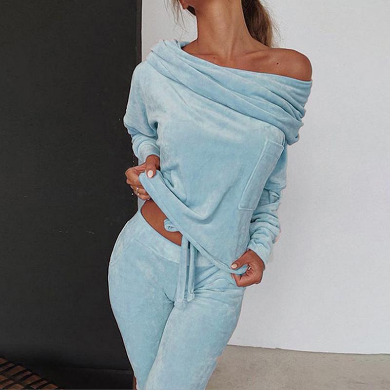 Осенне-зимний женский модный однотонный спортивный костюм, повседневные топы с открытыми плечами и длинными рукавами + брючный костюм