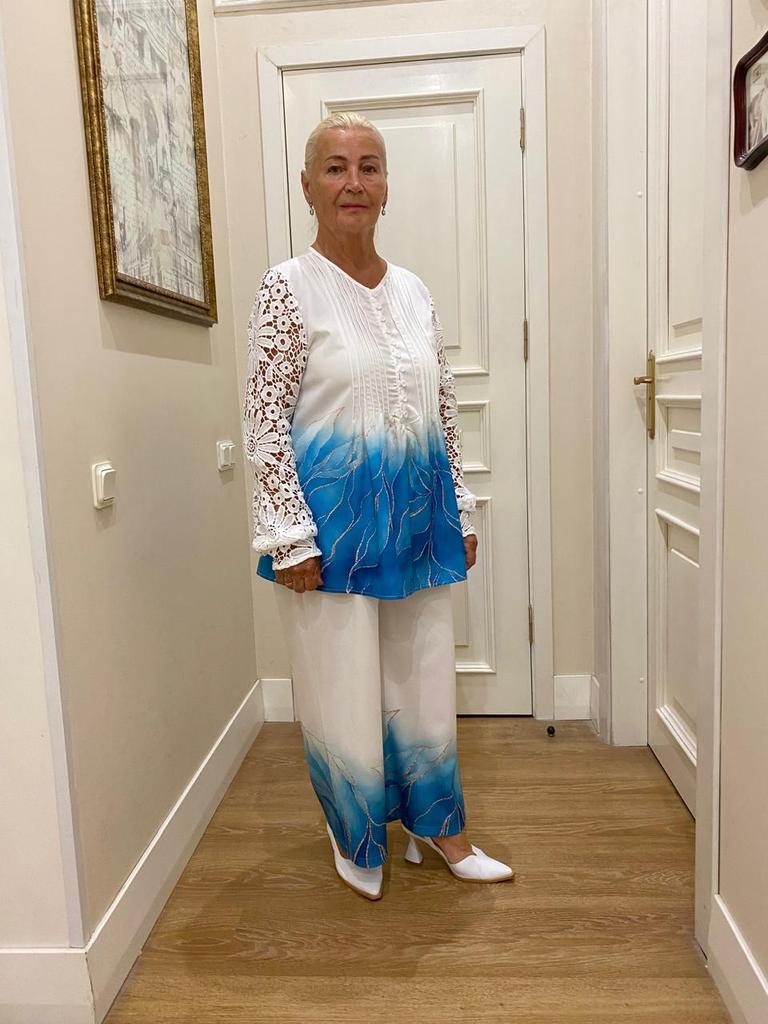 Получила заказ относительно быстро! Костюм несколько отличается от фото. Расцветка более насыщенная, темнее, чем на фото. Блуза ровная по низу, размер подошел, 2XL на рос.50 брала. А вот на брюки остро необходимо поменять лекала производителю. Несоответствие по размеру блузы и брюк! Если бы только по длине были больше, но и по ширине надо ушивать! После небольшой переделки можно будет носить. Костюм на каждый день!