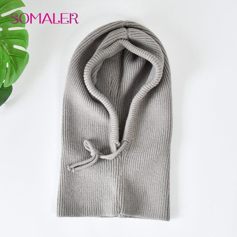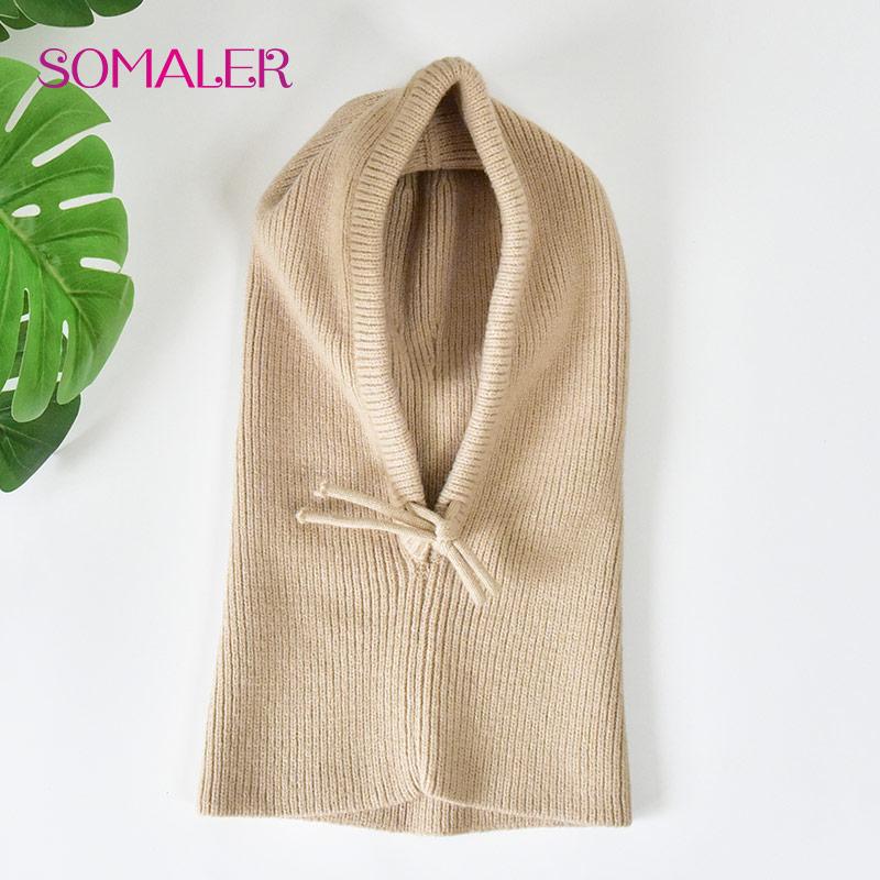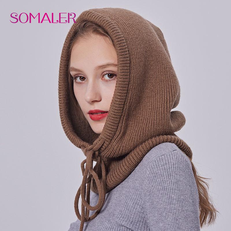 SOMALER Зимняя шерстяная вязаная акриловая шапка с капюшоном для женщин, утепленная шапка для ушей, однотонная регулируемая шапка-шарф с веревкой