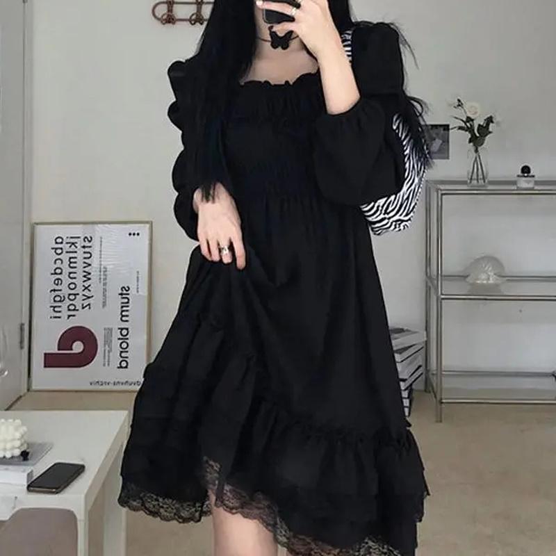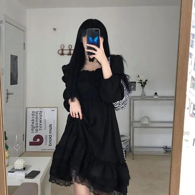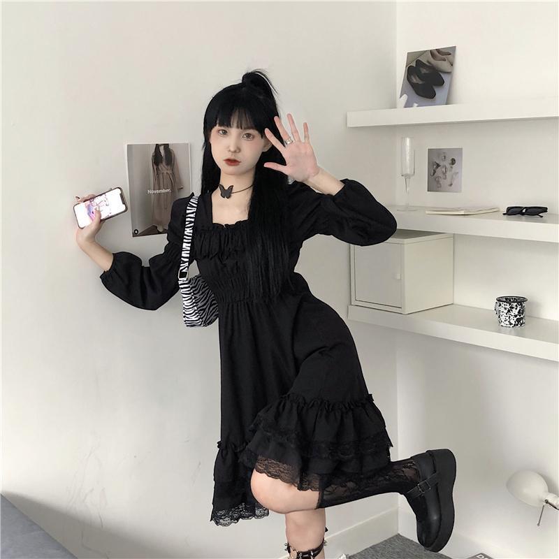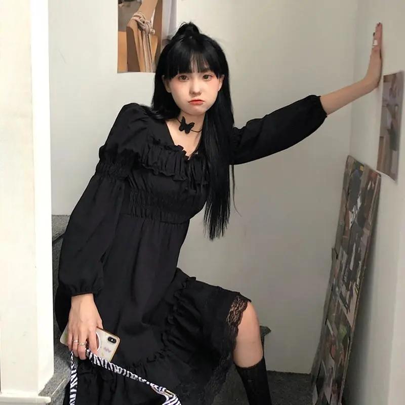 Готическое черное кружевное платье с рюшами для девочек, праздничное платье принцессы с рюшами, сказочные платья в стиле гранж с длинными рукавами, женская мода в корейском стиле