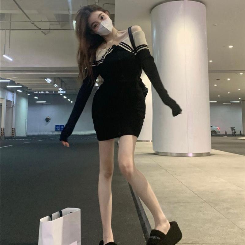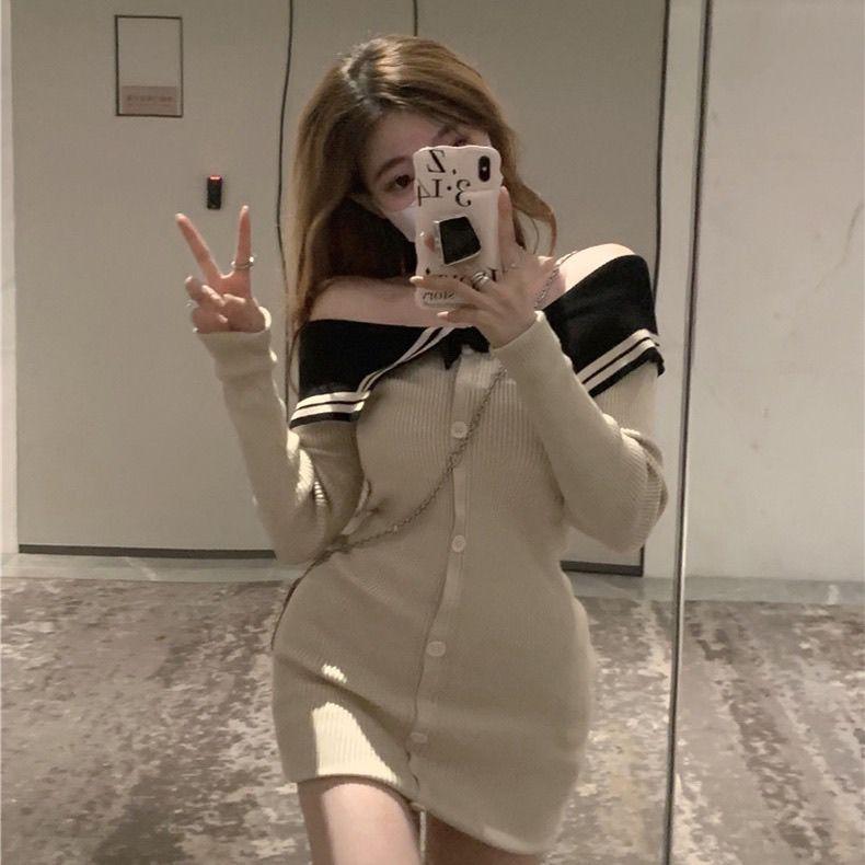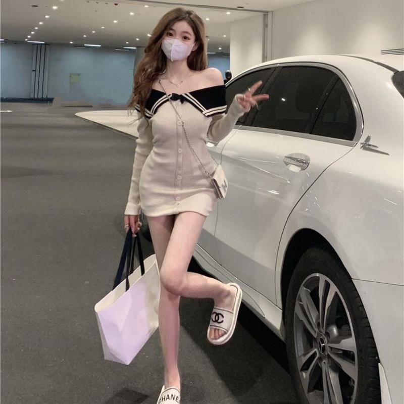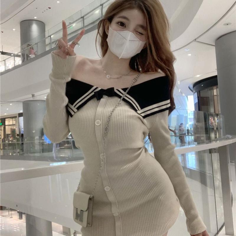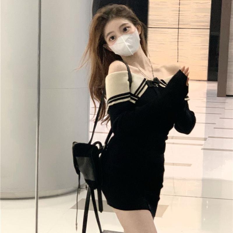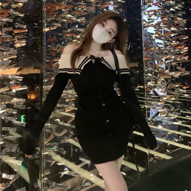 Сексуальное вязаное вязаное платье-свитер, мини-платье с открытыми плечами, корейская мода, облегающее платье с запахом, тонкие короткие платья, вечерняя вечеринка Kpop