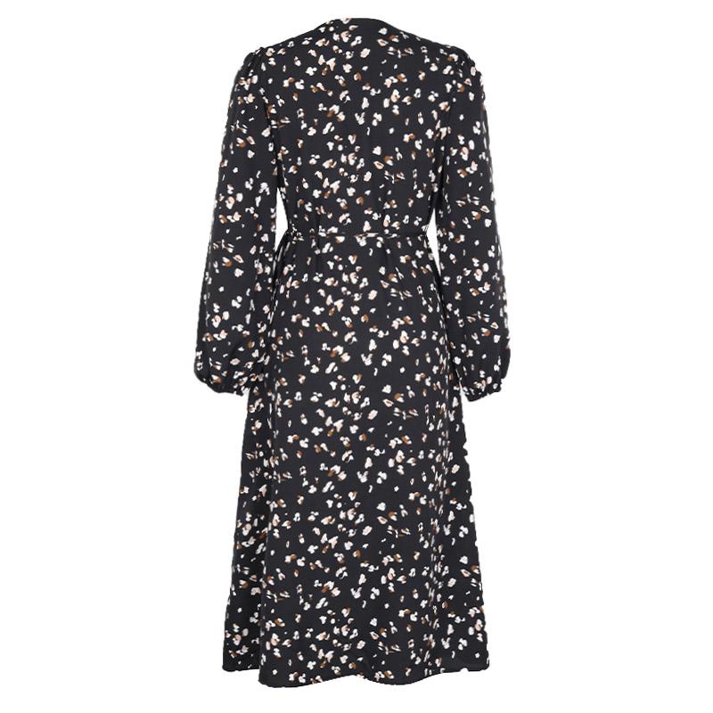 Осенняя женская мода на шнуровке с v-образным вырезом и длинными рукавами, трапециевидная юбка, черное длинное платье средней талии с принтом
