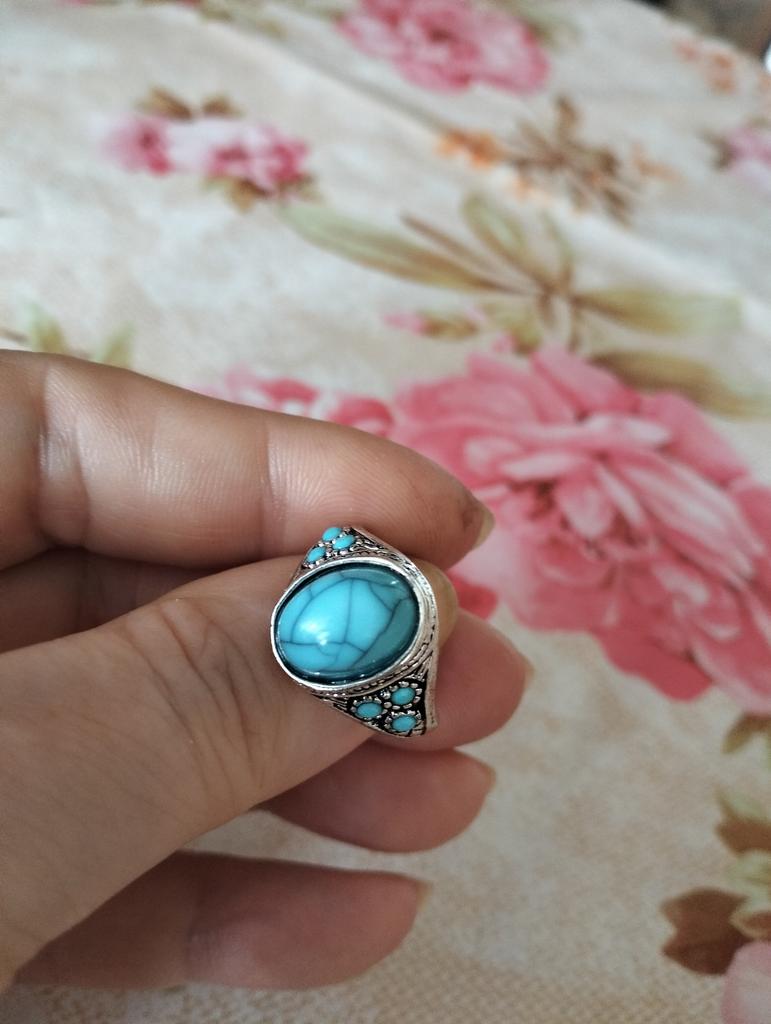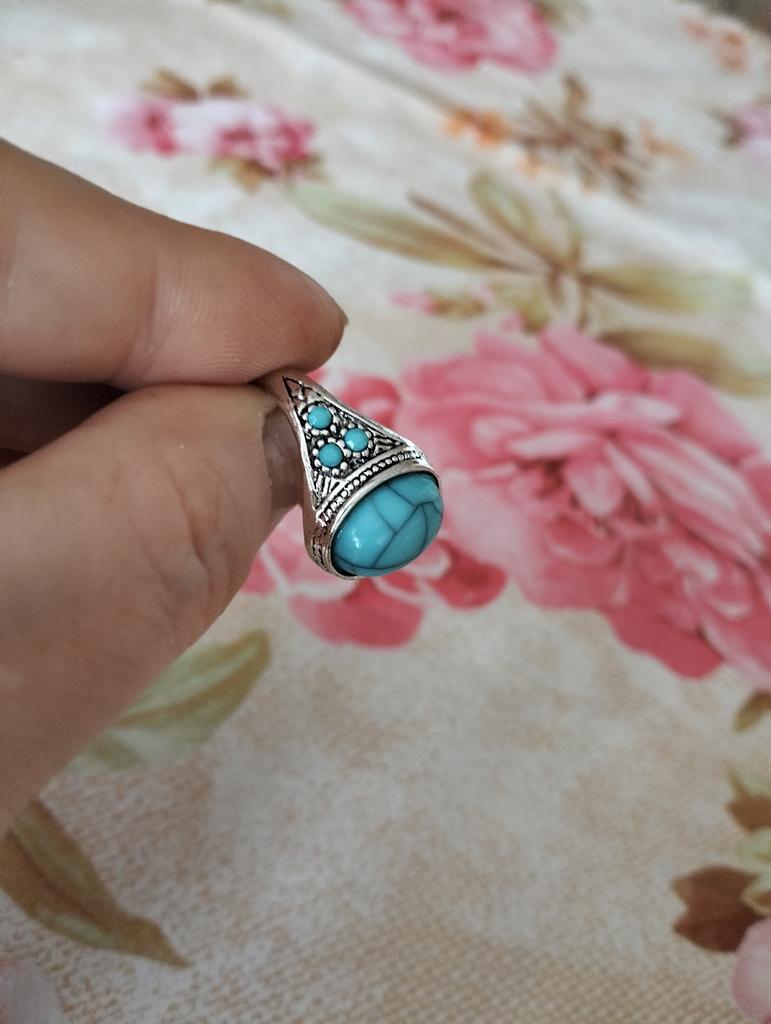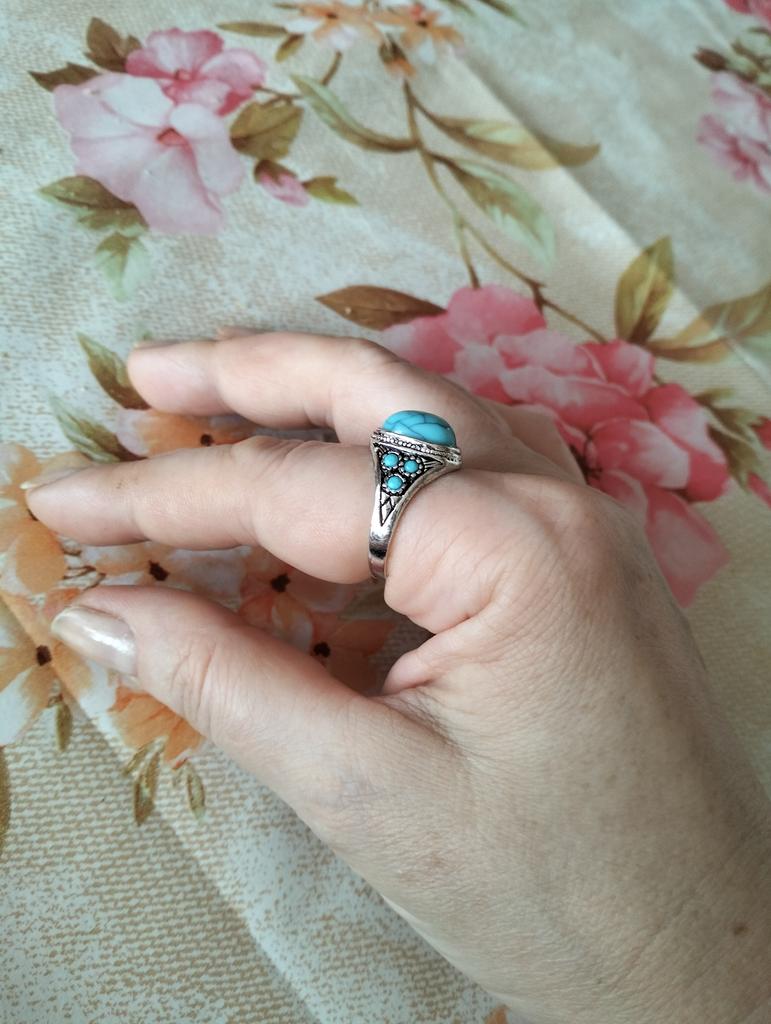 На фото выглядит презентабельней. Бирюзовый "камень " больше похож на пластилин Сделано красиво, аккуратно... Видно, что цена кольцу семьдесят рублей .